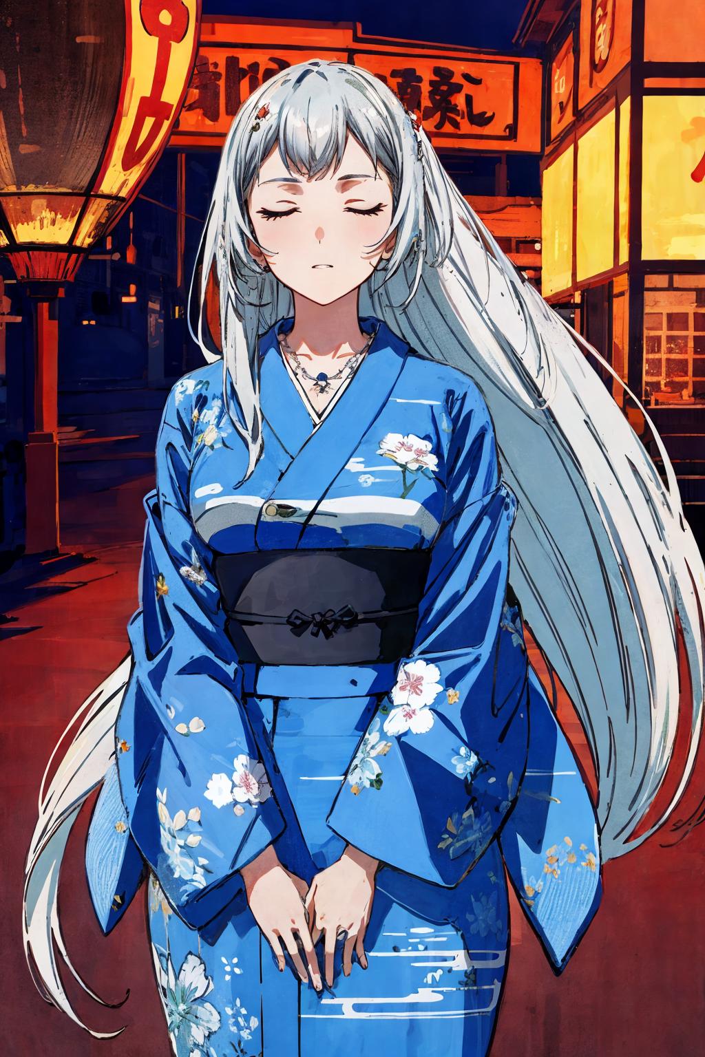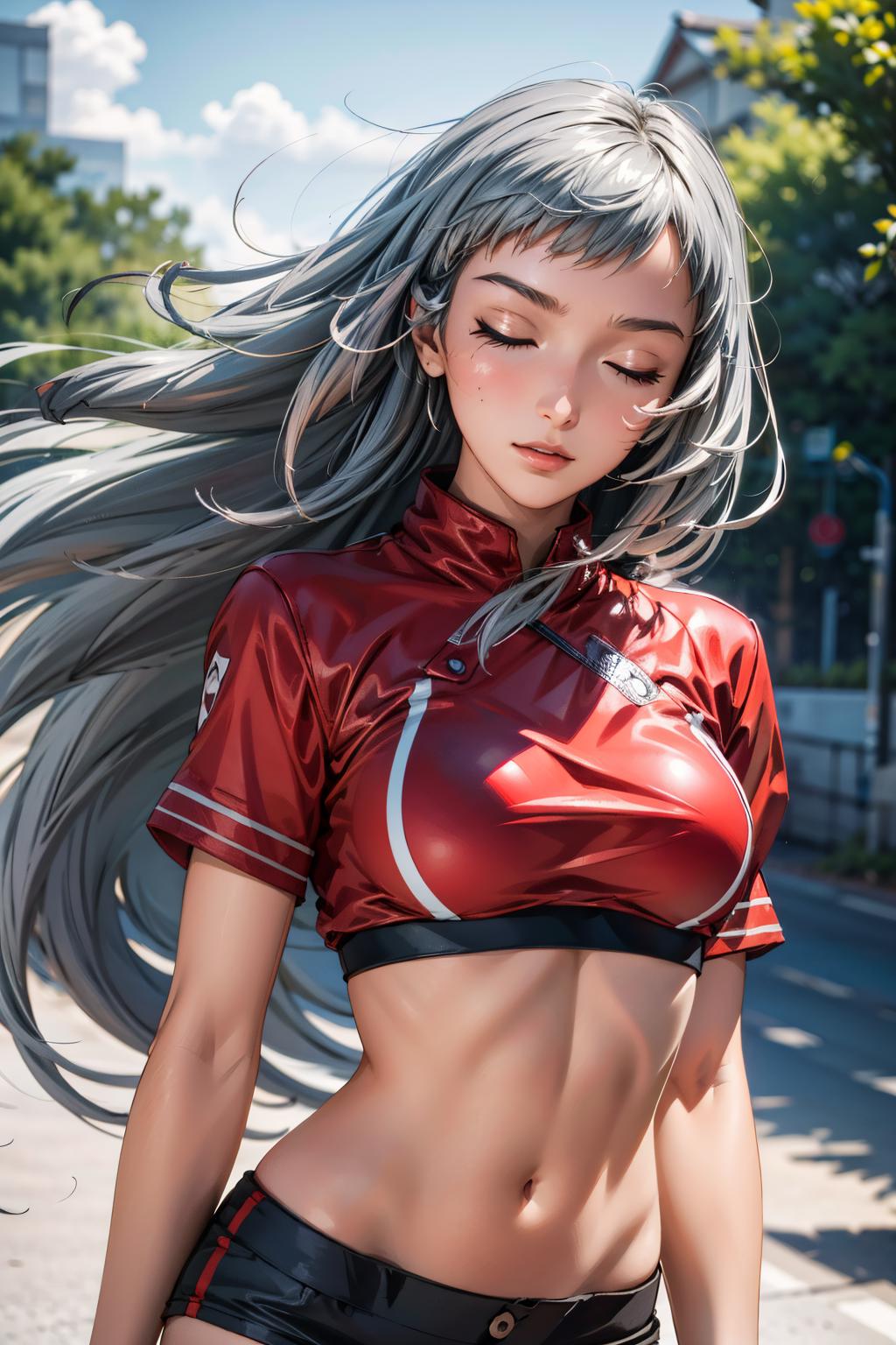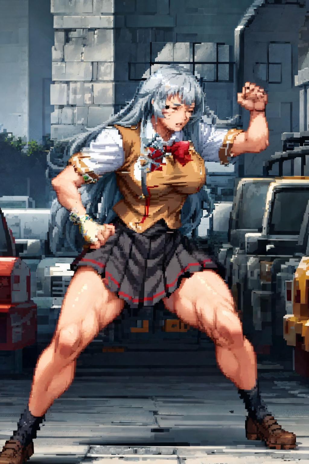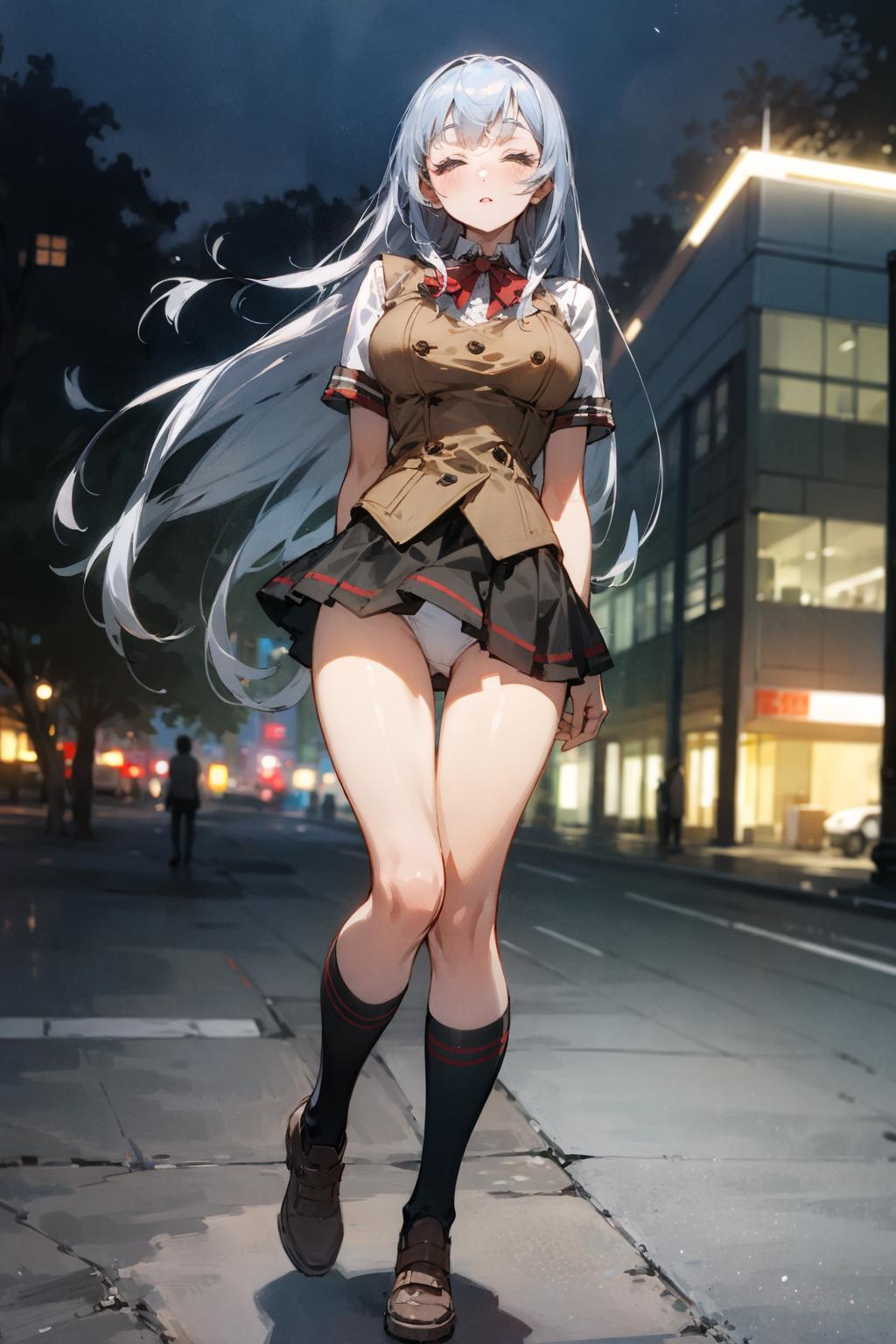 shiryuuwz, very long hair, closed eyes, school uniform, pleated skirt, miniskirt, grey hair, large breasts, fingerless gloves, short sleeves, bowtie, shirt, vest