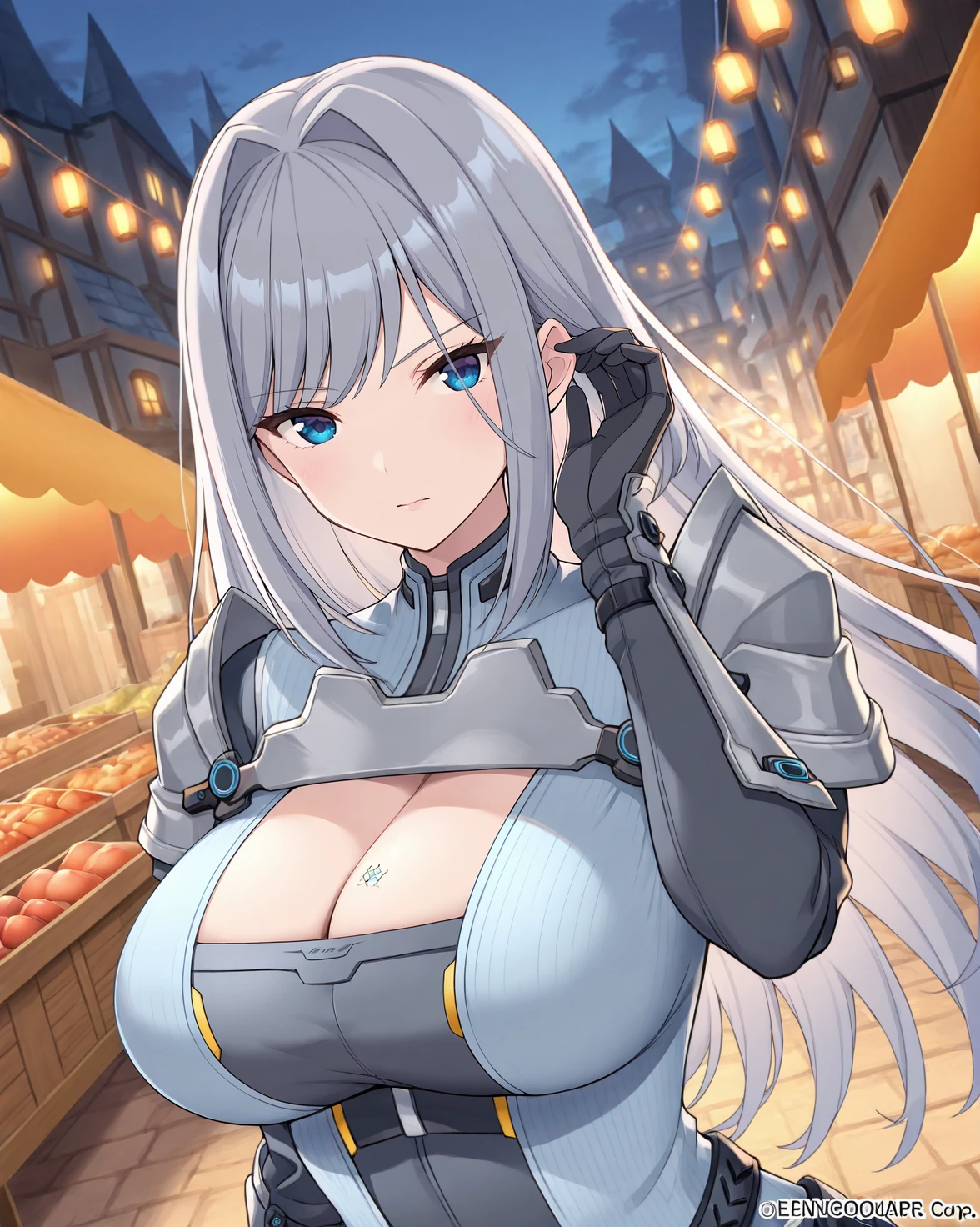 Recommended: 1girl, huge breasts, long hair, grey hair, blue eyes, cleavage, armor, shoulder armor, chest tattoo