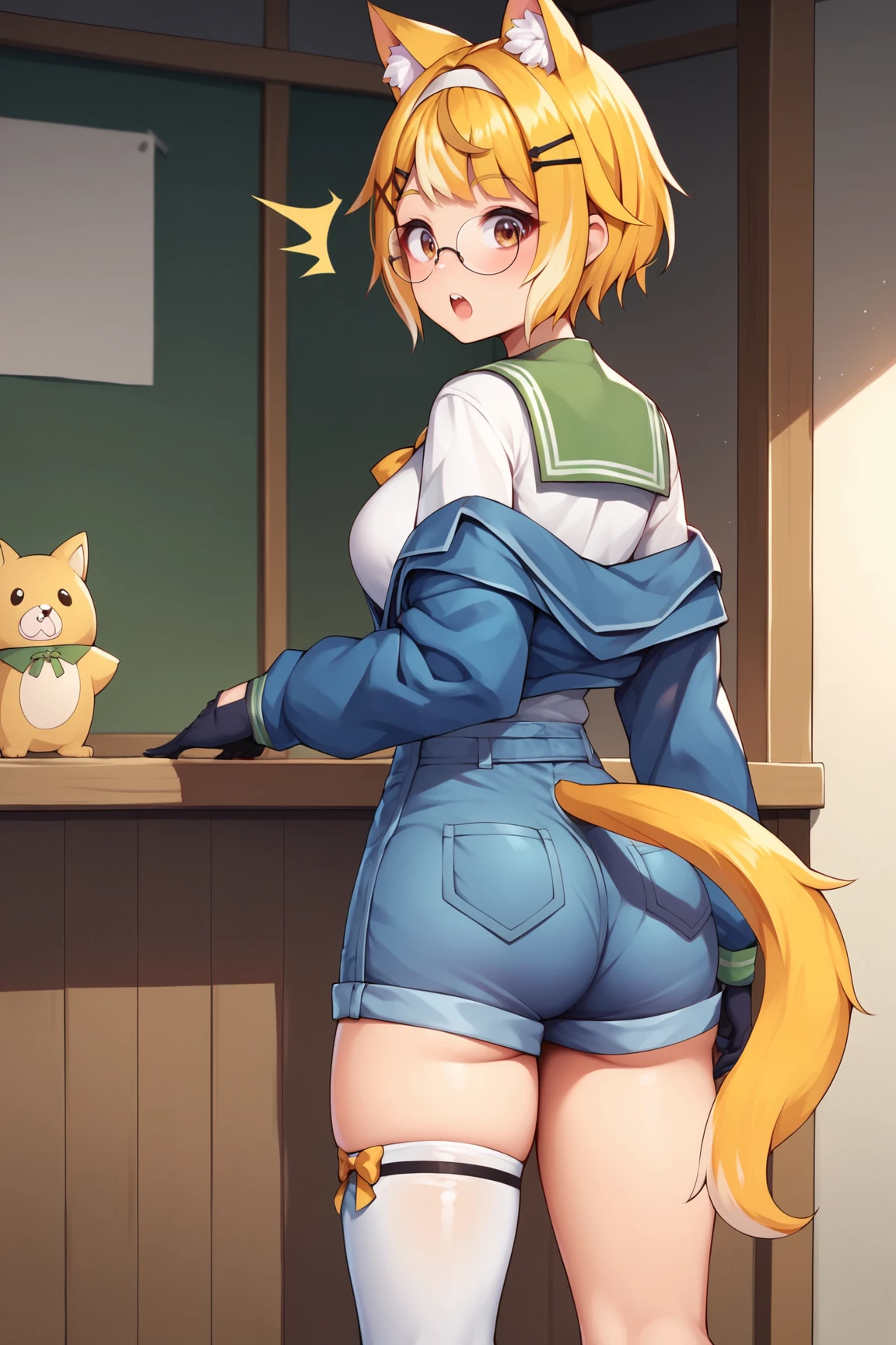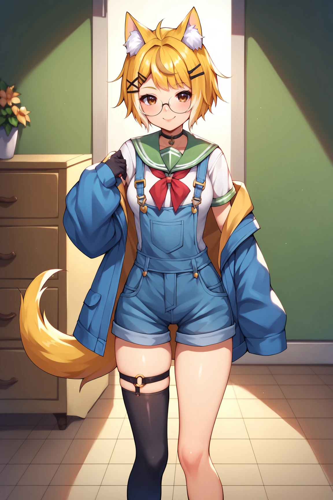 āžœ TriforceMoonVTXL, brown eyes, blonde hair, multicolored hair, short hair, hair ornament, animal ears, glasses, medium breasts, off shoulder, blue jacket, sleeves past writs, serafuku, yellow bowtie, (green sailor collar), school uniform, (overalls:1.2), black gloves, short jean, tail, asymmetrical legwear, single thighhighs, boots