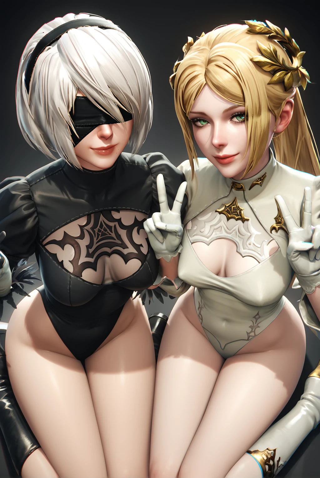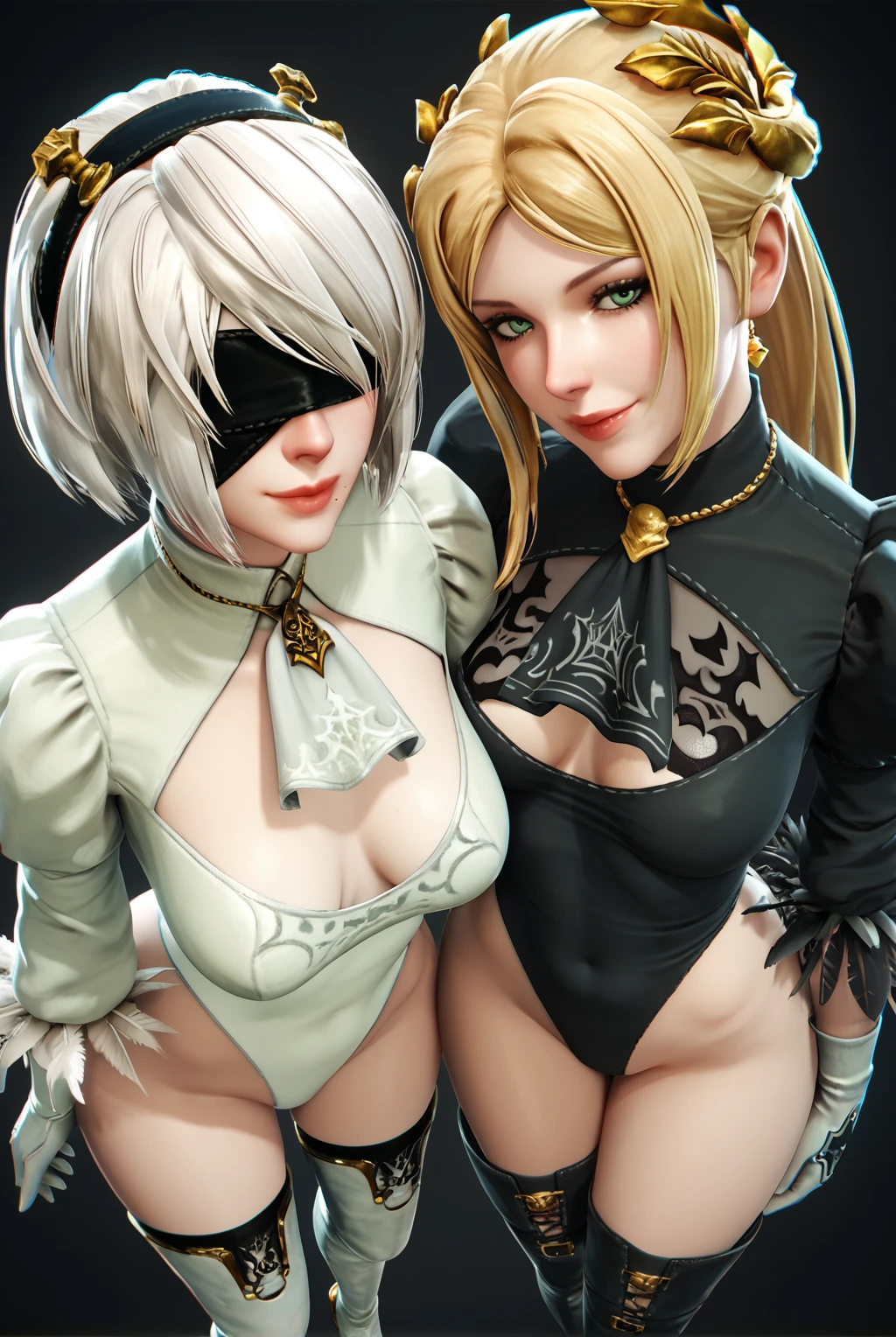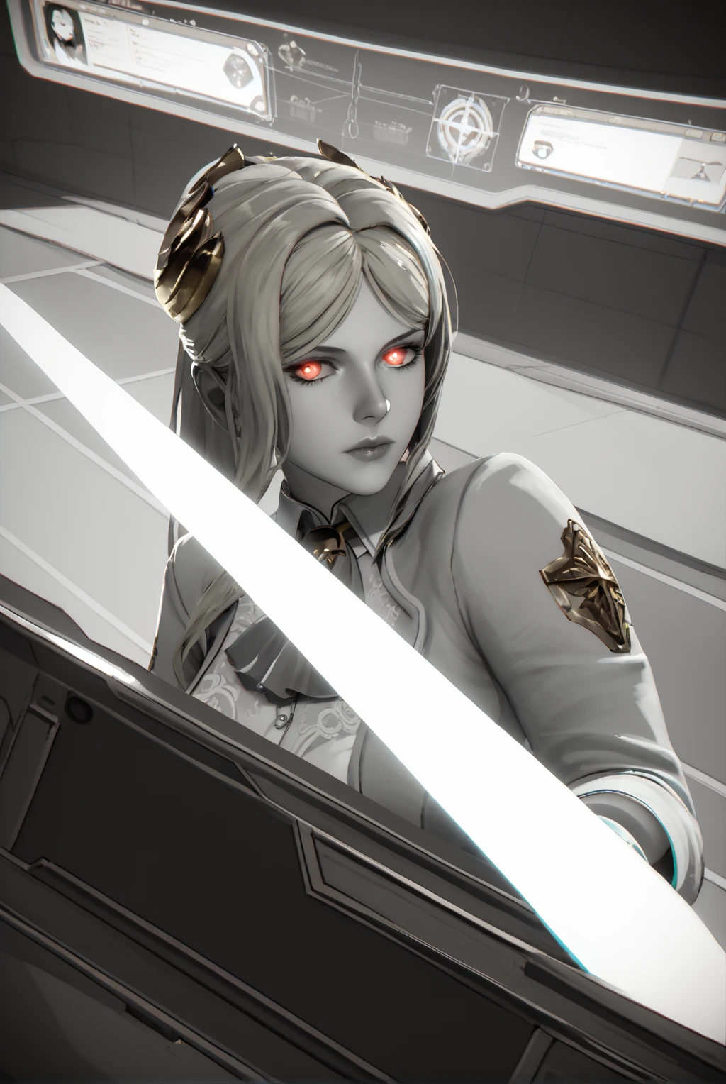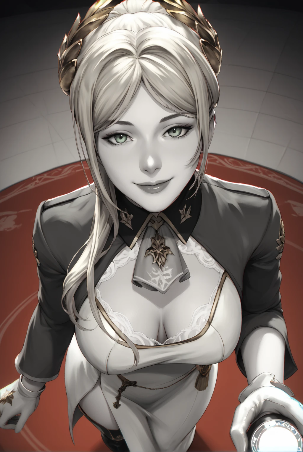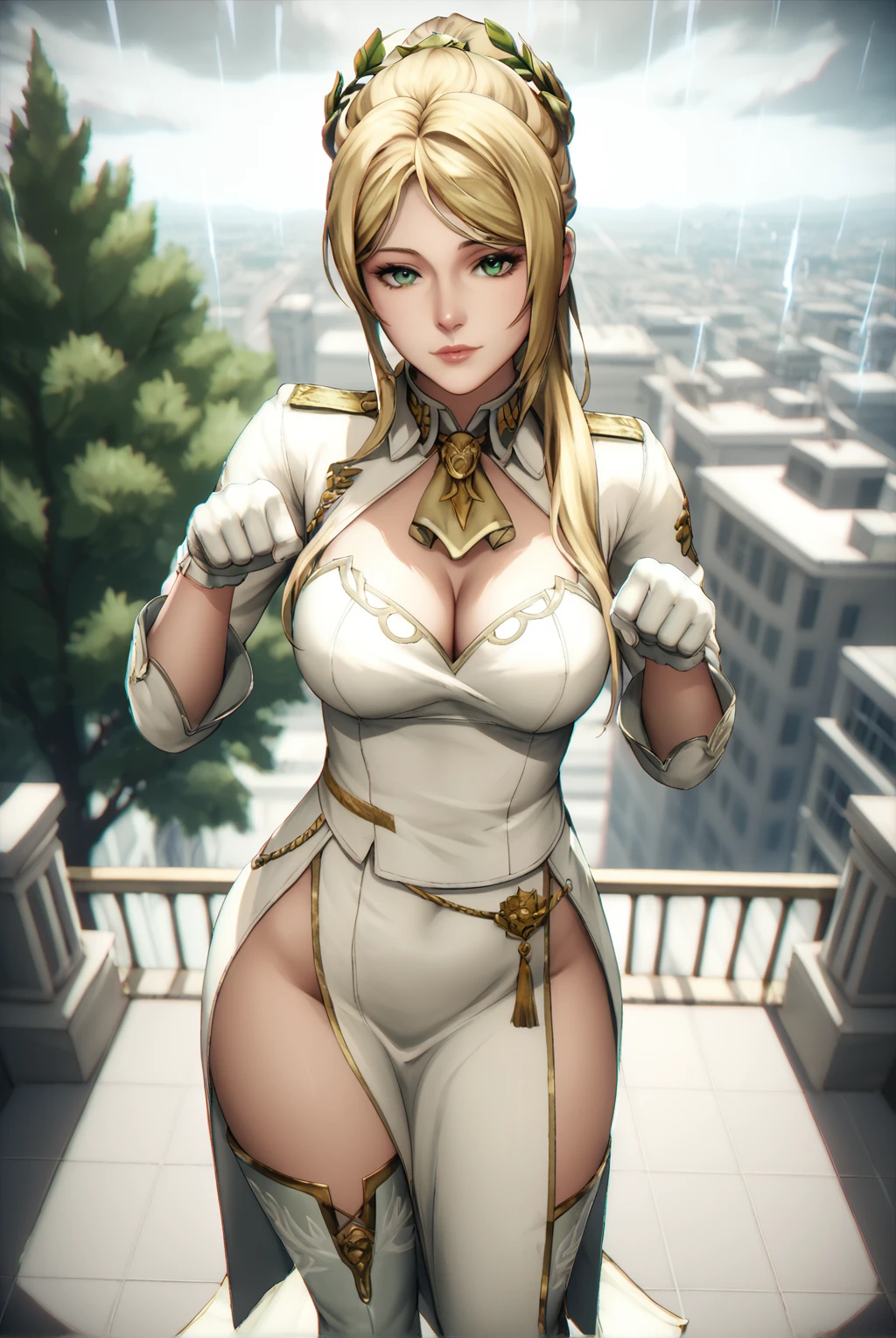 long hair, blonde hair, ponytail, parted bangs, green eyes, gold trim, long sleeves, hair ornament, white gloves, white dress, thigh boots, side slit, ascot, golden laurel crown, Commander's dress, Commander's outfit