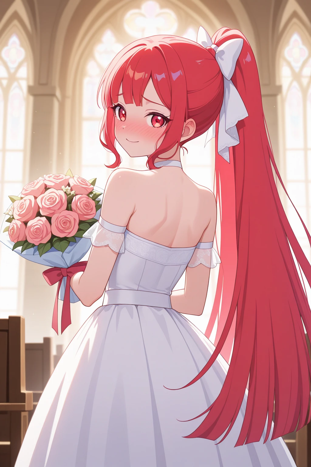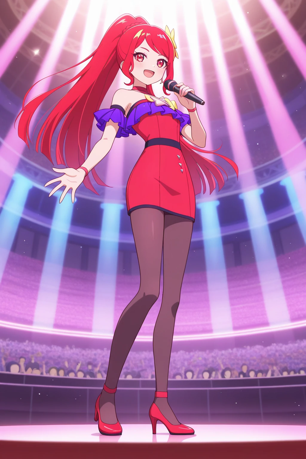 aiprisakura, red hair, hair ornament, ponytail, red eyes, red dress, idol clothes, pantyhose, red high heels