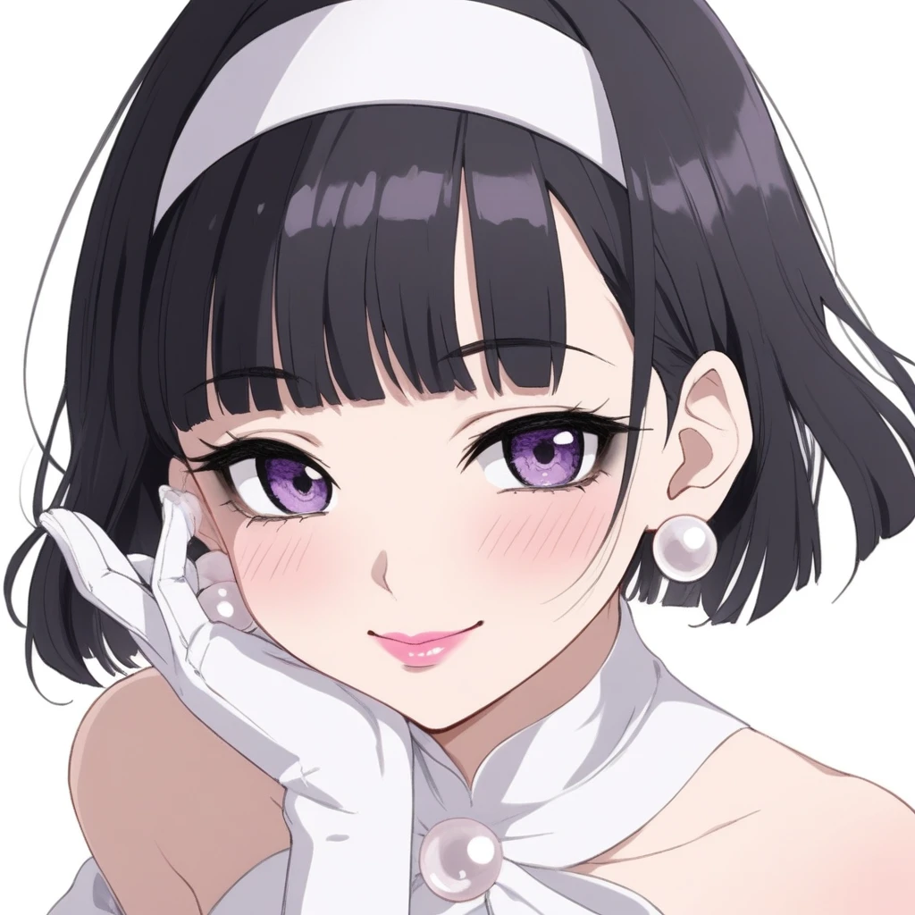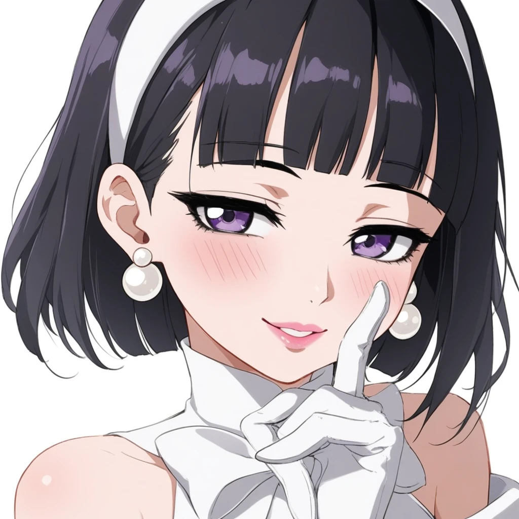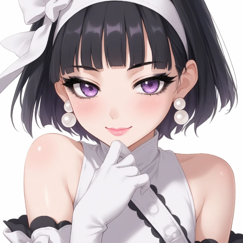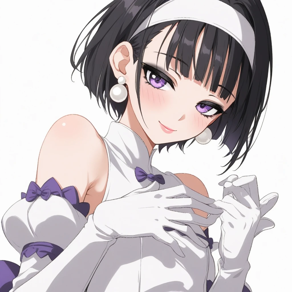 Sua, 1girl, solo, short hair, black hair, blunt bangs, purple eyes, blush, earrings, white headband, makeup, black eyeliner, black eyeshadow, pink lips, smile, white tube dress, white pearl earrings, white bow above the hem, bare shoulders, long gloves, white gloves, separate sleeves, puffed sleeves, looking at viewer, white background,