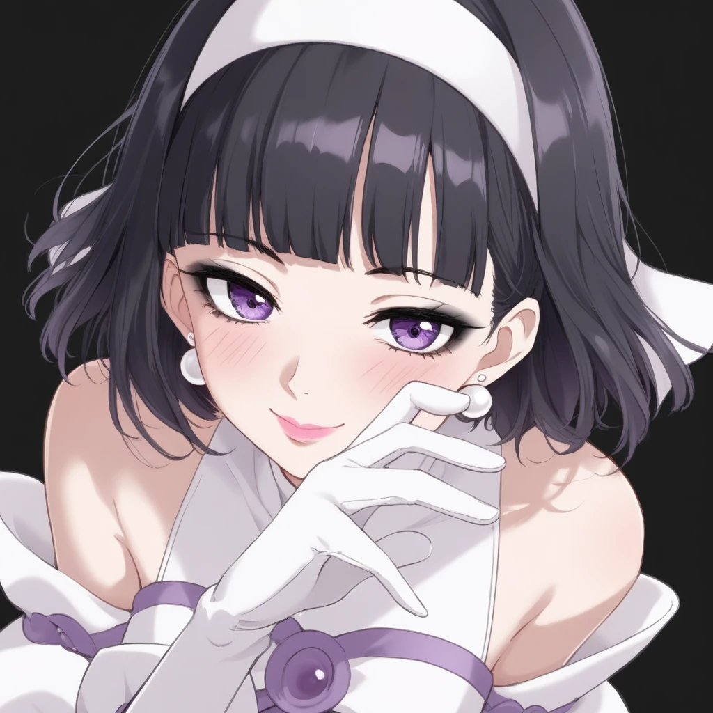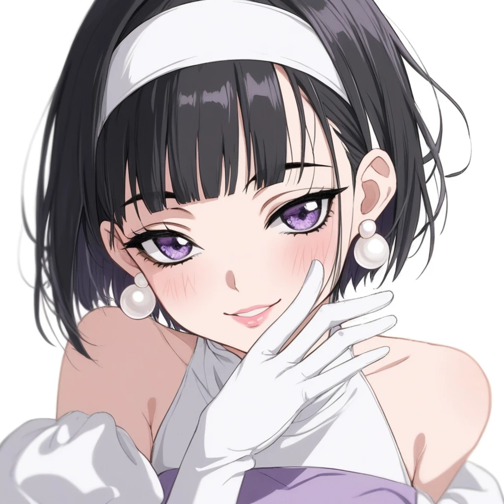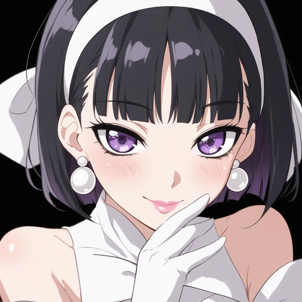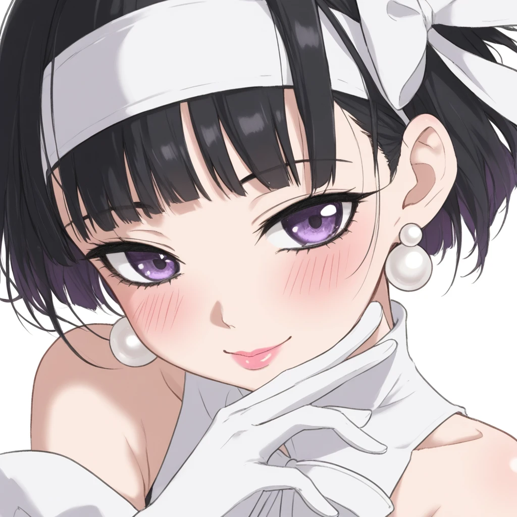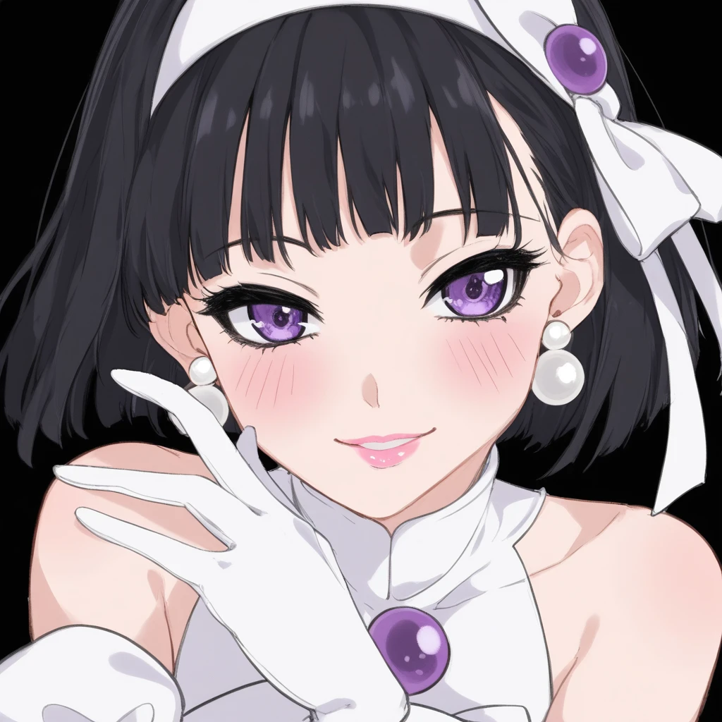 Sua, 1girl, solo, short hair, black hair, blunt bangs, purple eyes, blush, earrings, white headband, makeup, black eyeliner, black eyeshadow, pink lips, smile, white tube dress, white pearl earrings, white bow above the hem, bare shoulders, long gloves, white gloves, separate sleeves, puffed sleeves, looking at viewer, white background,