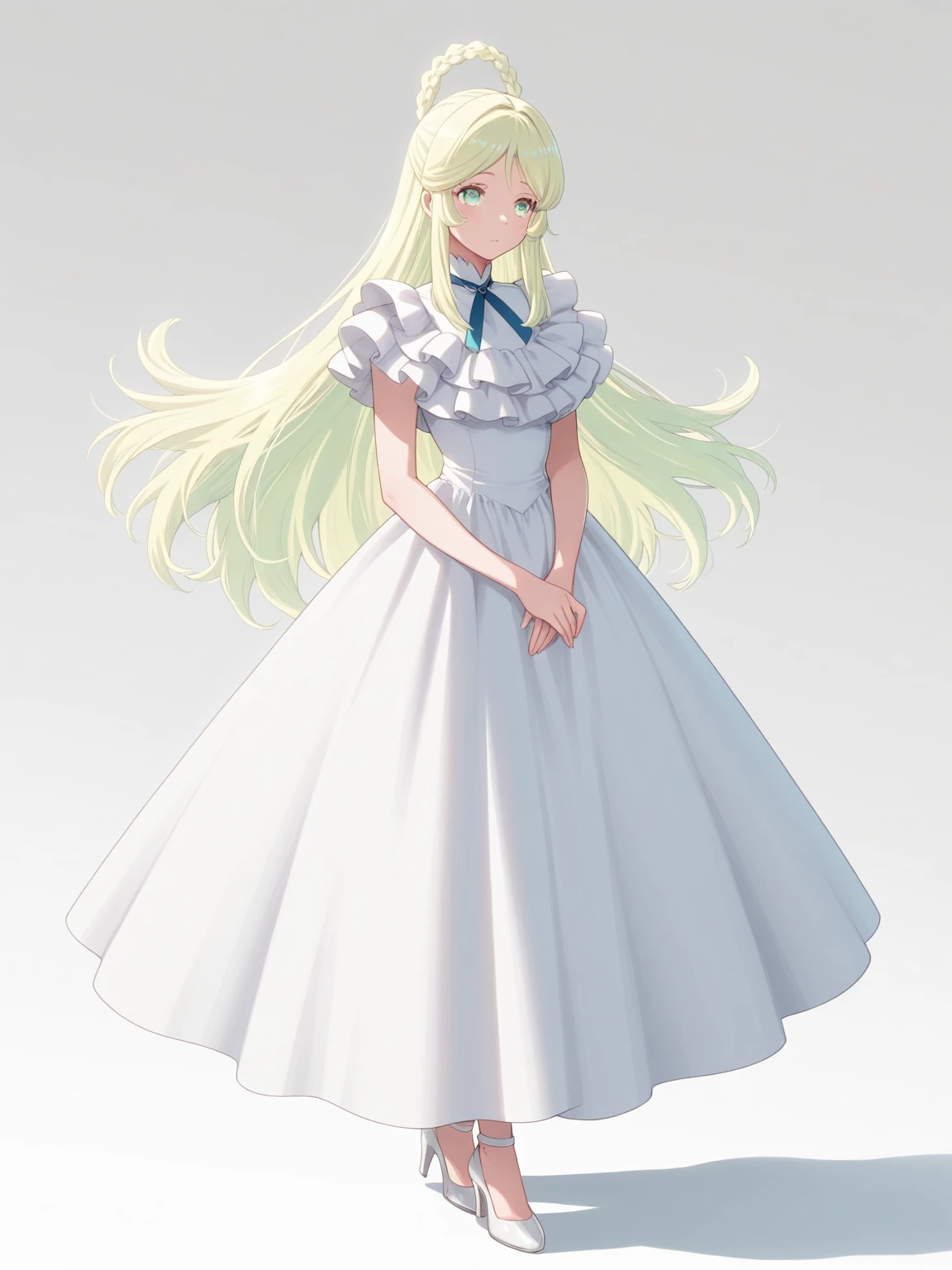Dress: (AthenaDress, green eyes, blonde hair, long hair, hair rings, braid), (white dress, white collar, high collar, frills), (blue neck ribbon), white high heels,