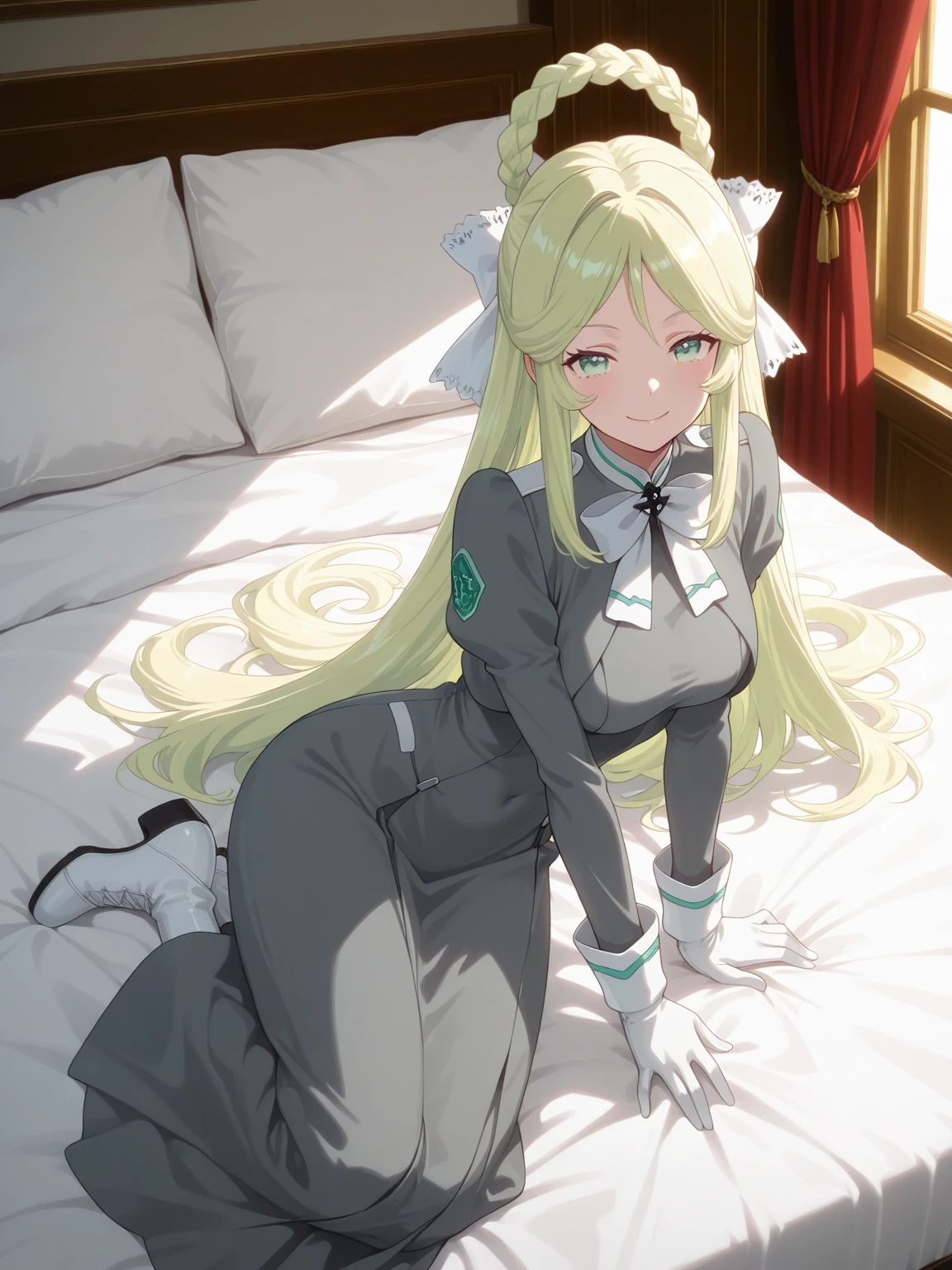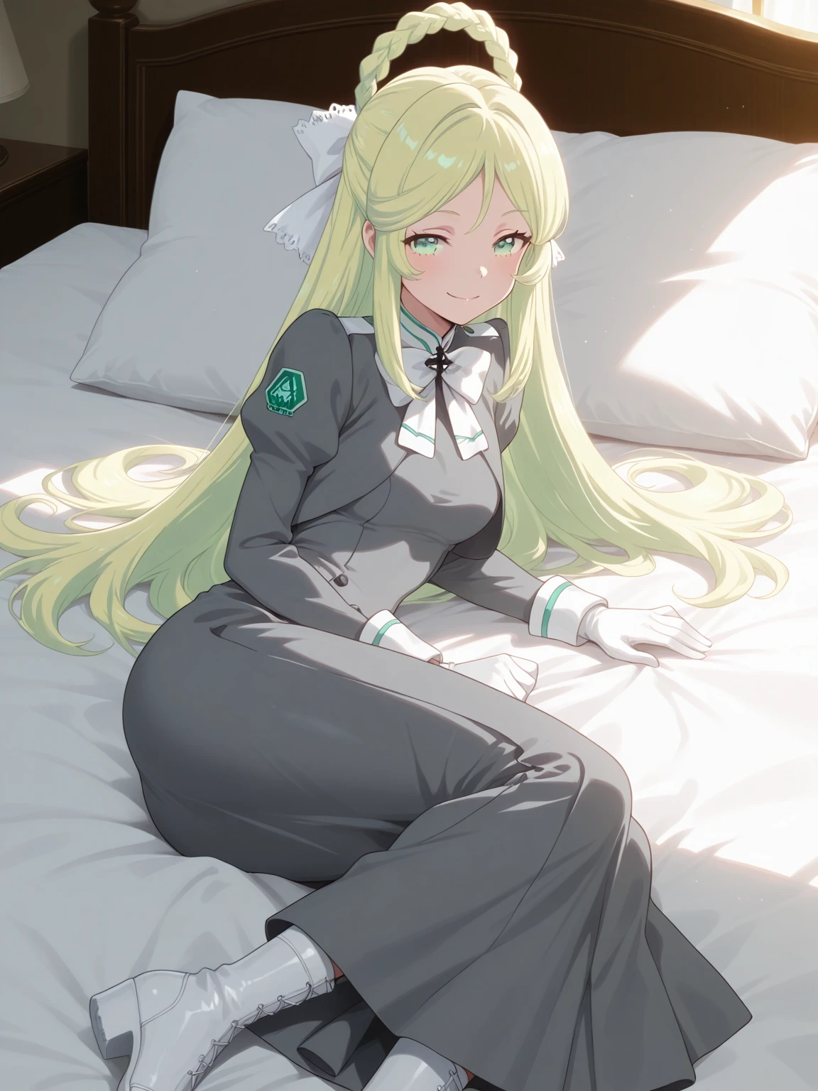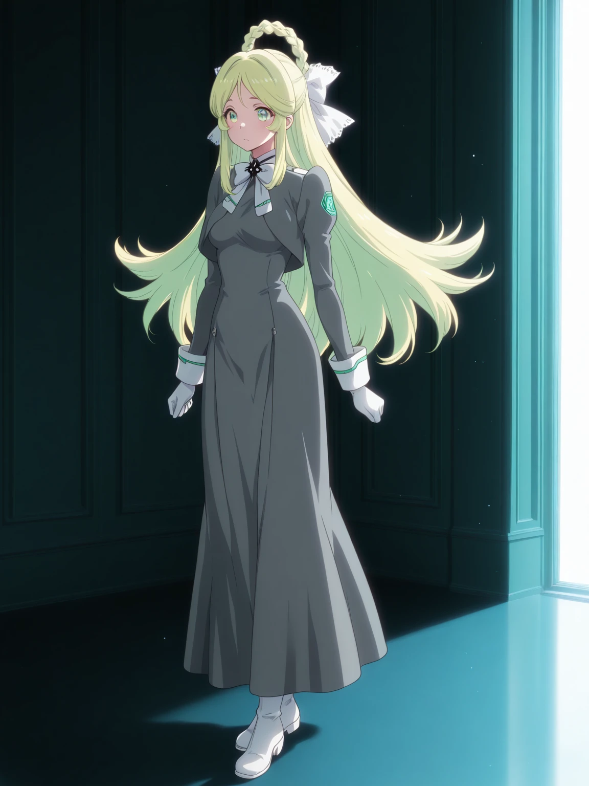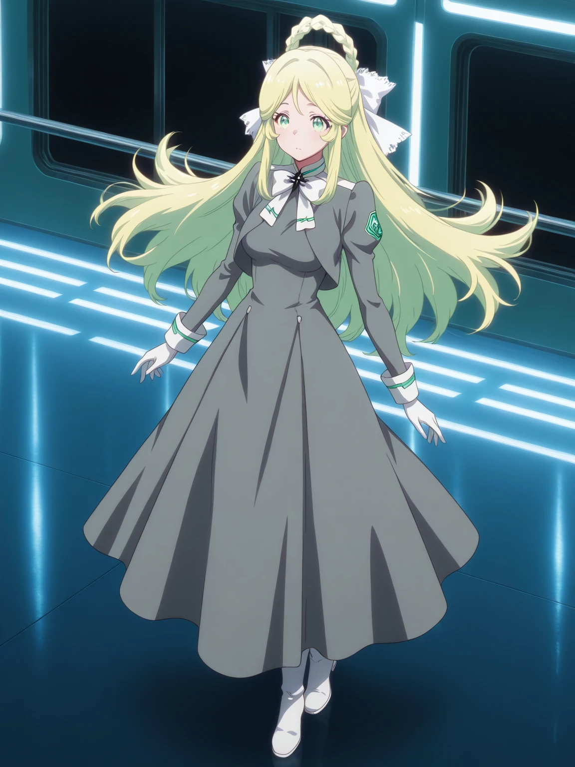 Uniform: (AthenaUniform, green eyes, blonde hair, long hair, hair rings, braid, hair bow), gray dress, longdress, neck bow, white gloves, white boots