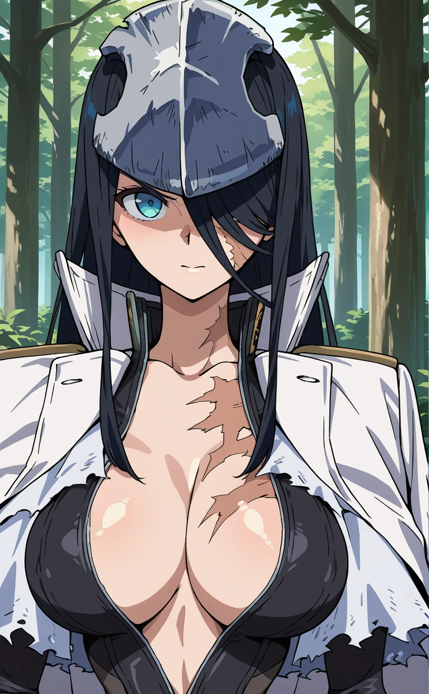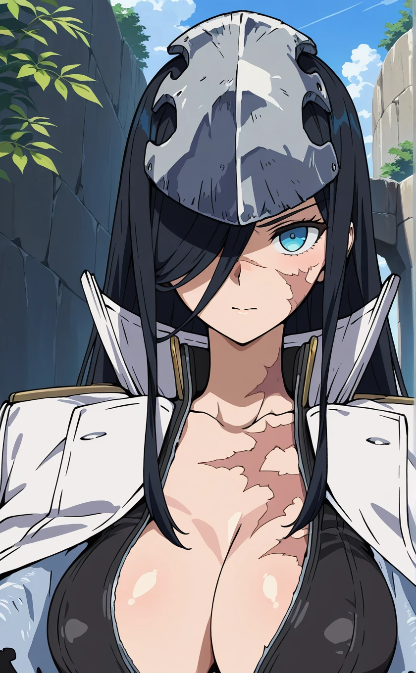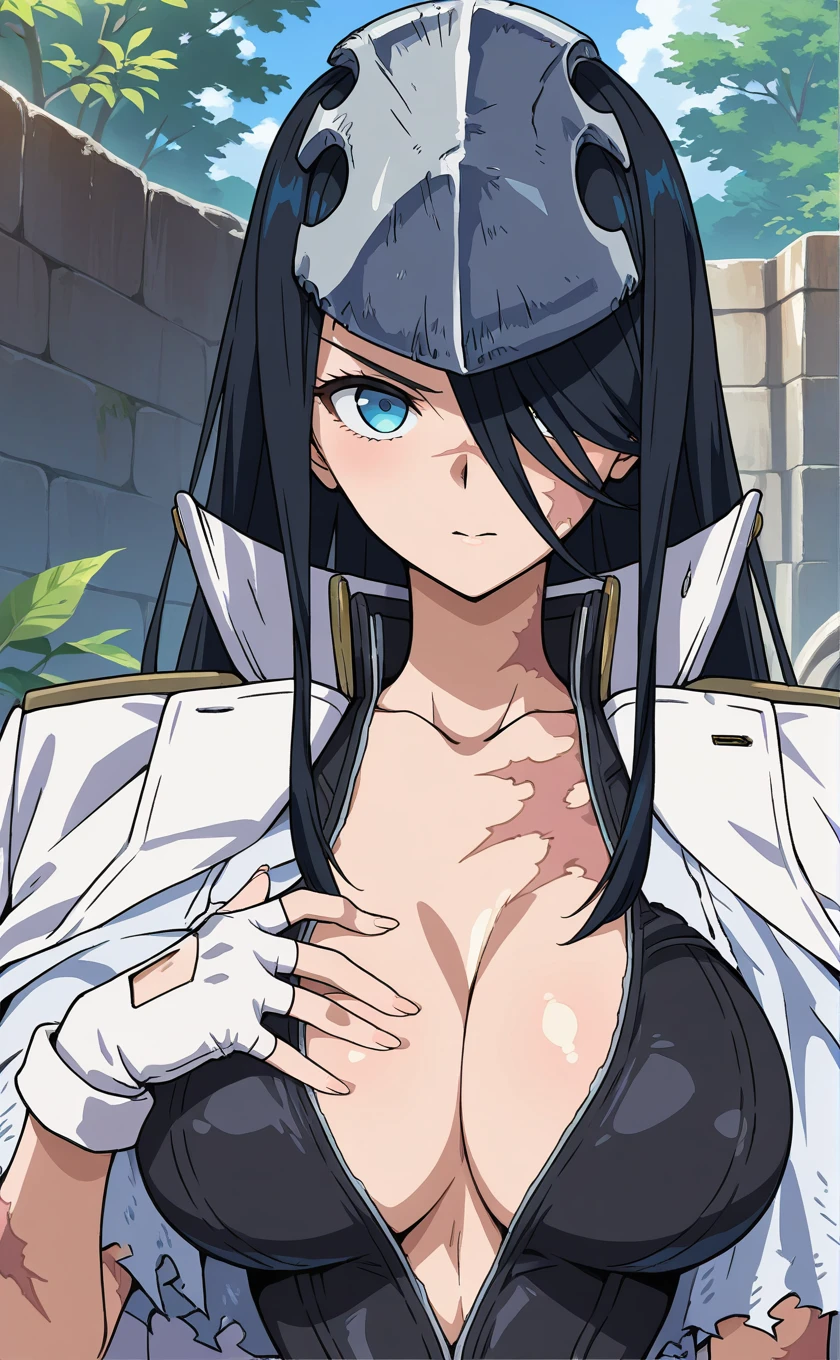 multiple scars,military coat,white coat,coat on shoulders,black ,,cleavage,fingerless gloves,white gloves,belt,armored boots,silver footwear