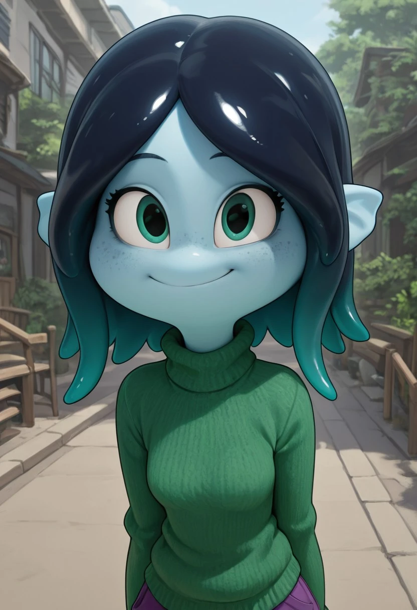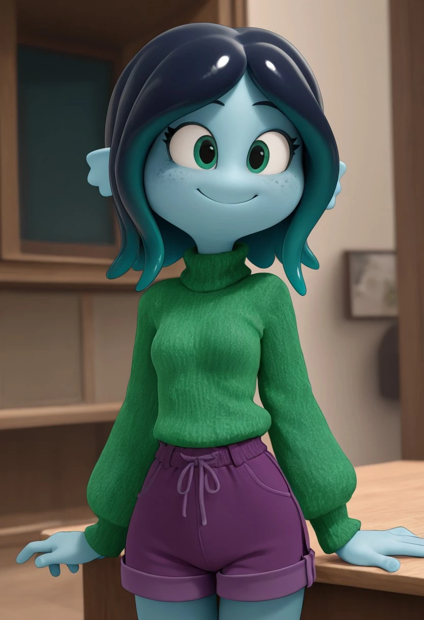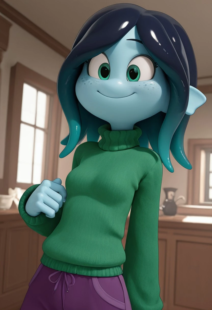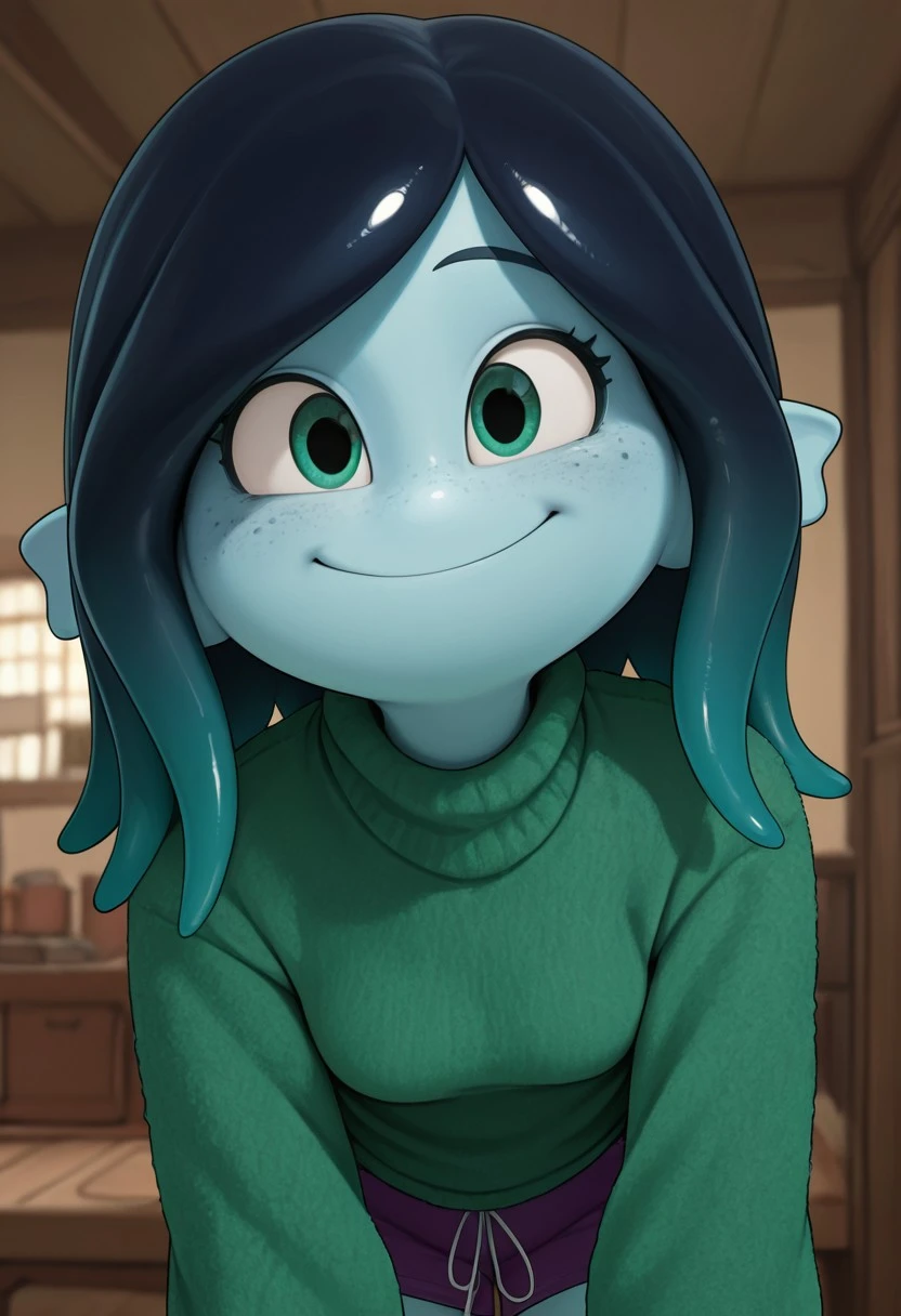 Rubyv1, 1girl , blue skin, kraken girl, teal eyes, green eyes,blue tentacle hair,medium hair, freckles, no nose,finn ears
