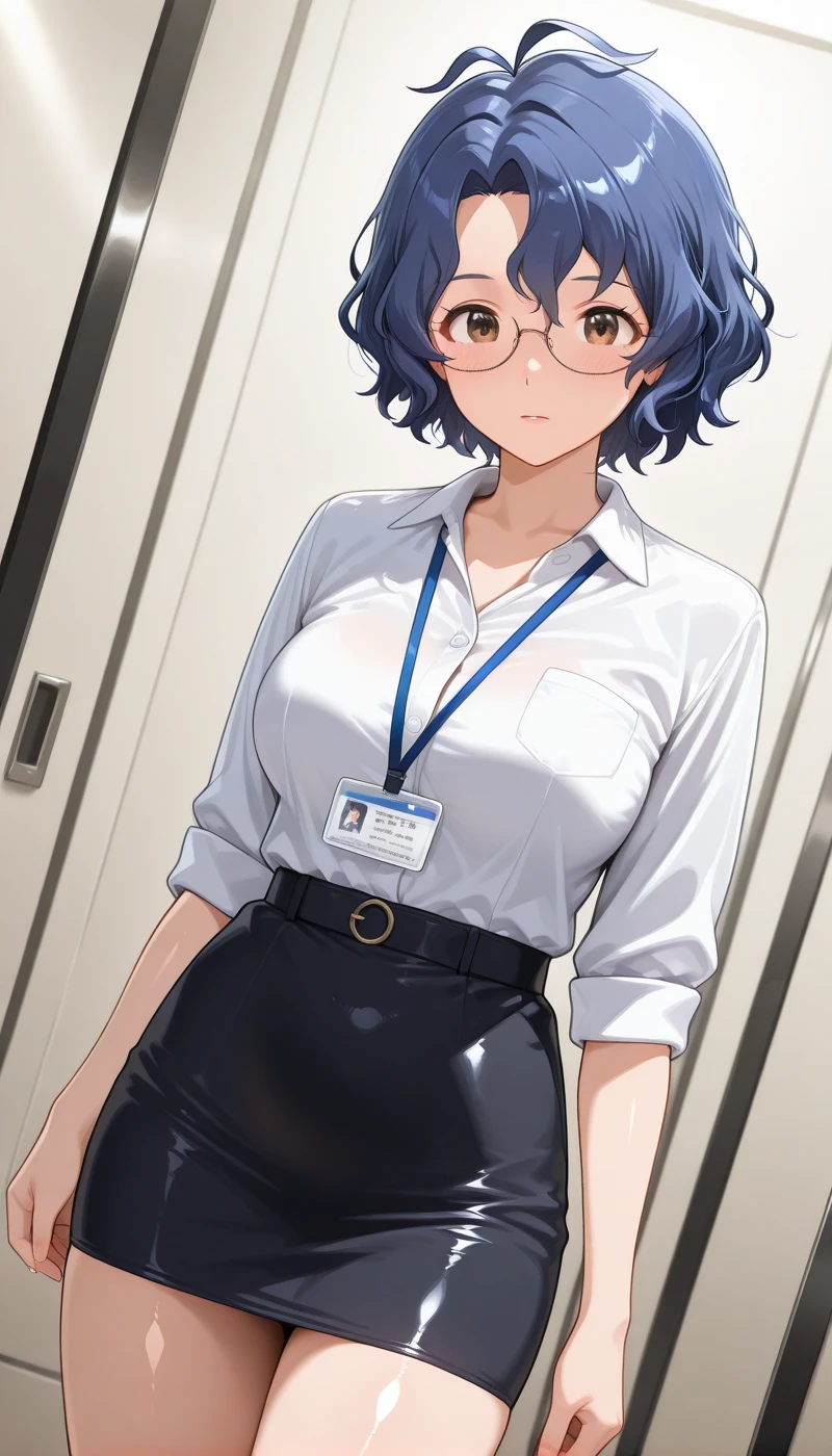 shirt, skirt, long sleeves, white shirt, thighs, collared shirt, glasses, black skirt, miniskirt, dress shirt, sleeves rolled up, pencil skirt, bespectacled, shirt tucked in, office lady, id card, lanyard, open collar,