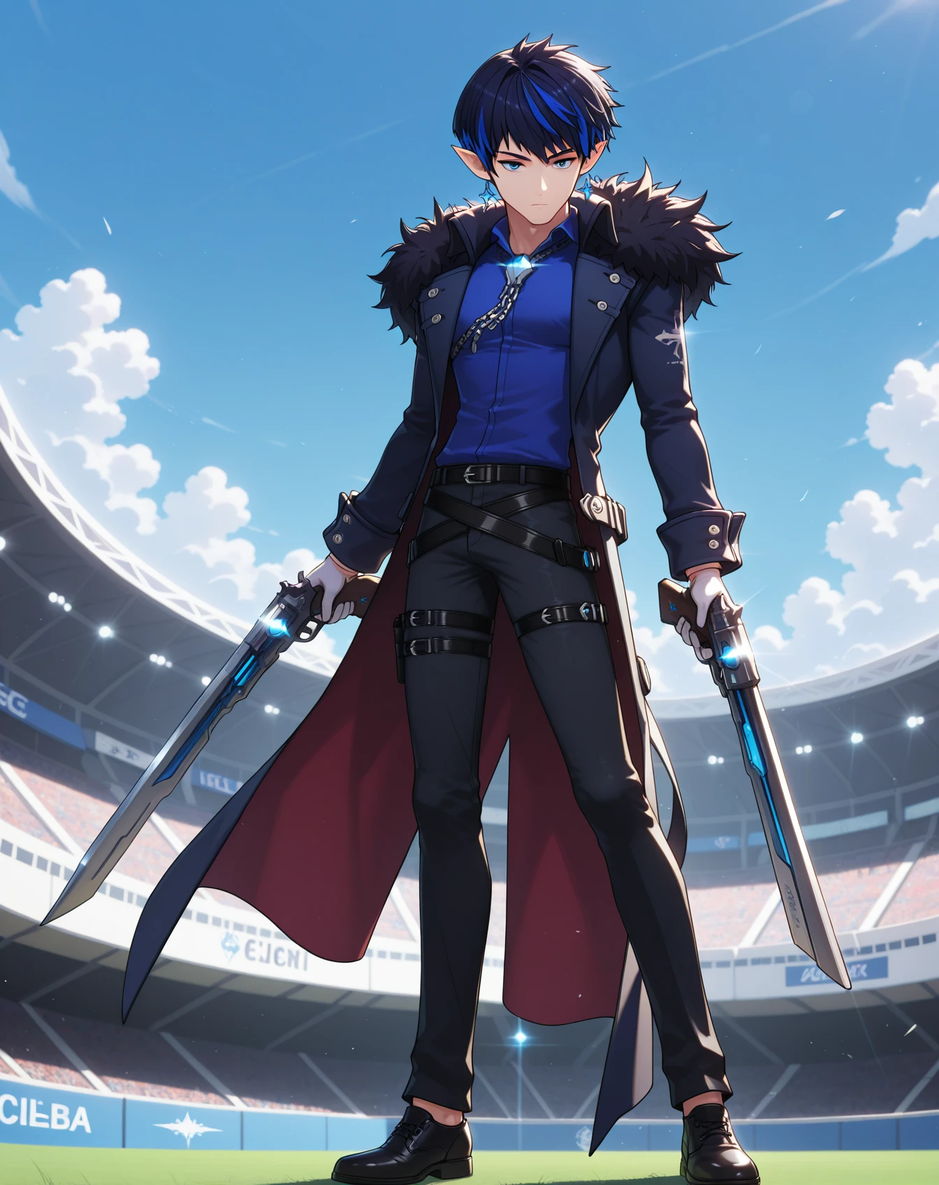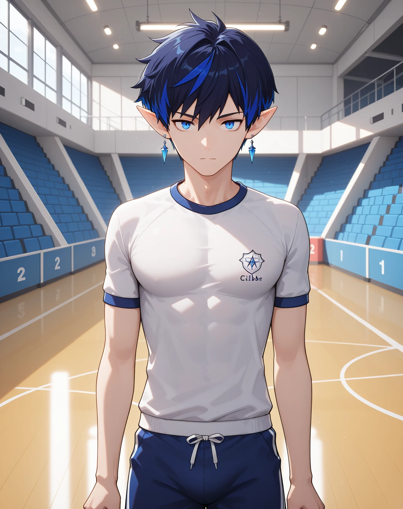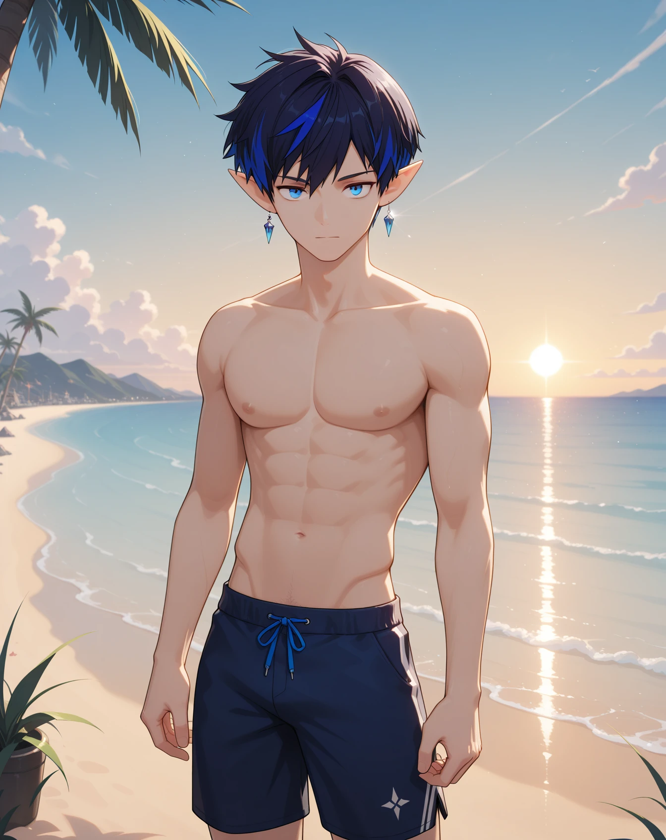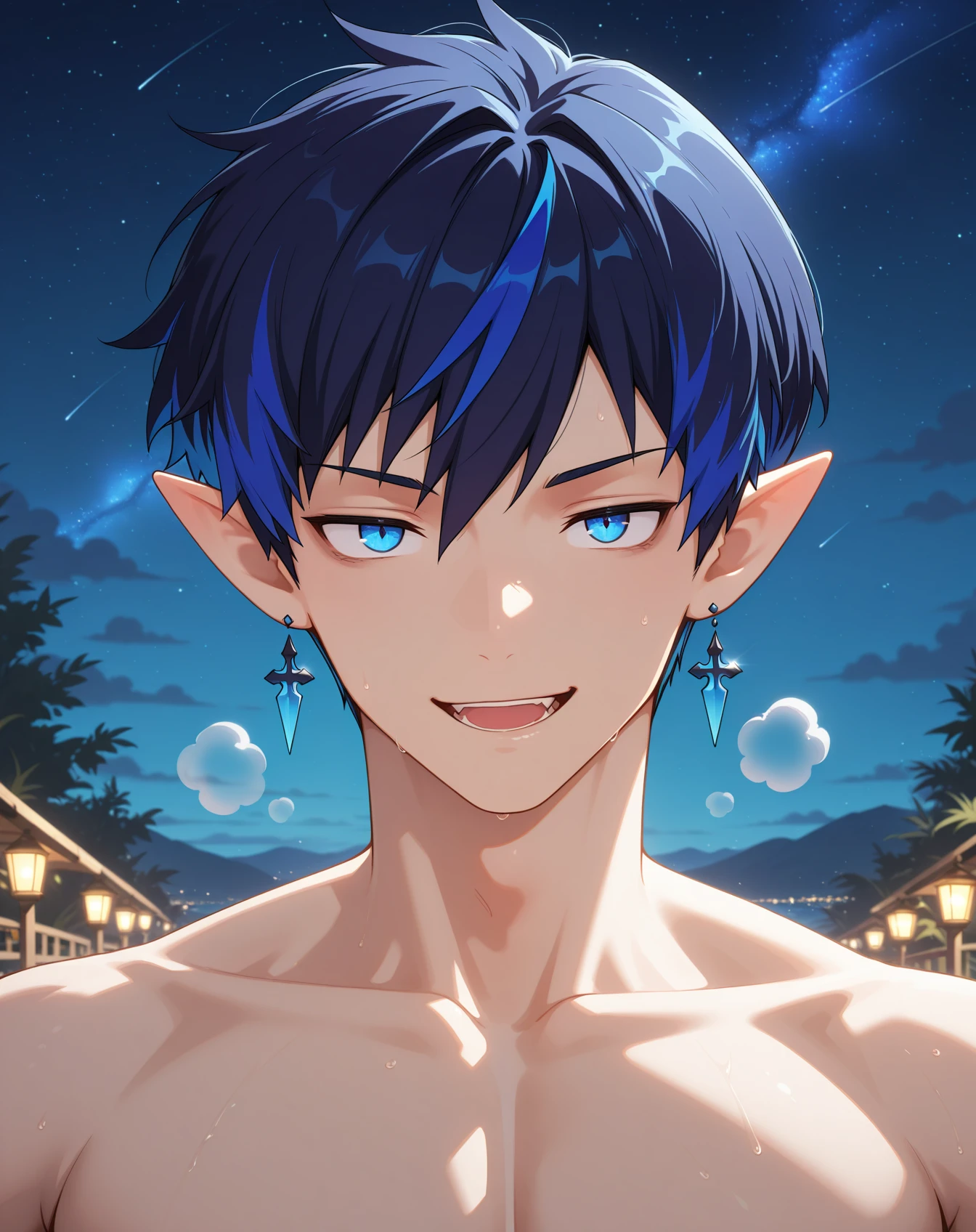 cielbase, pointy ears, blue eyes, black hair,multicolored hair,dark blue hair, two-tone hair, streaked hair,