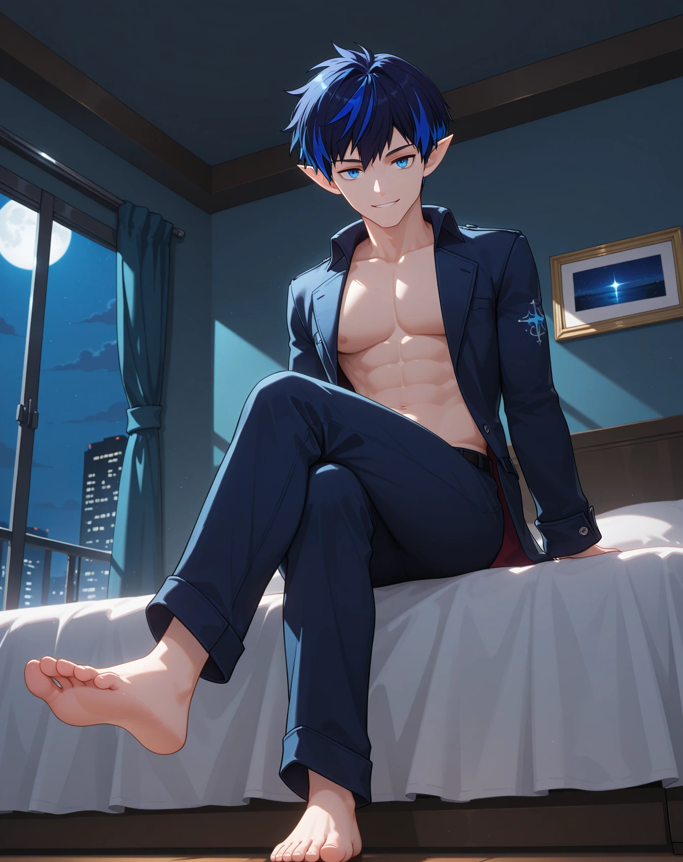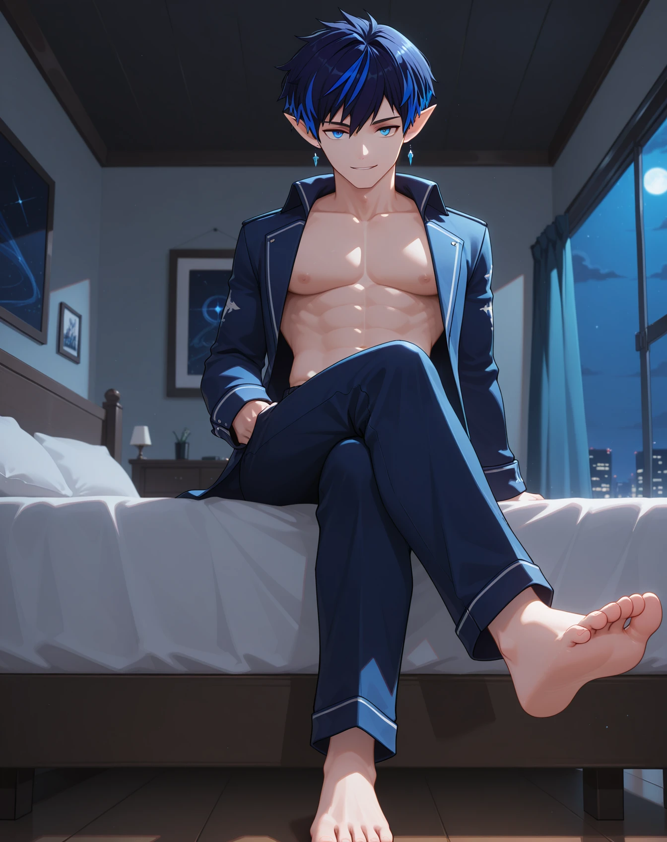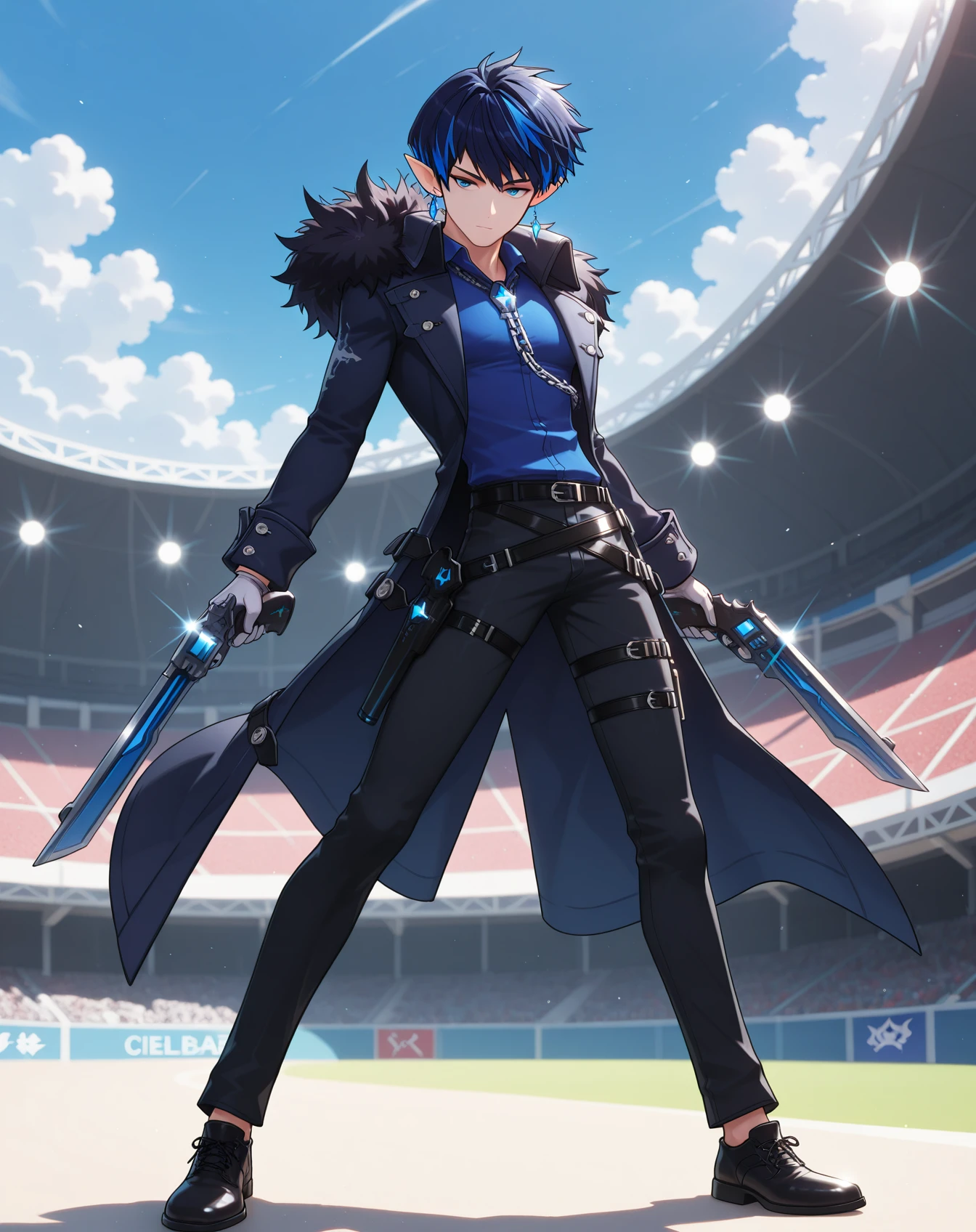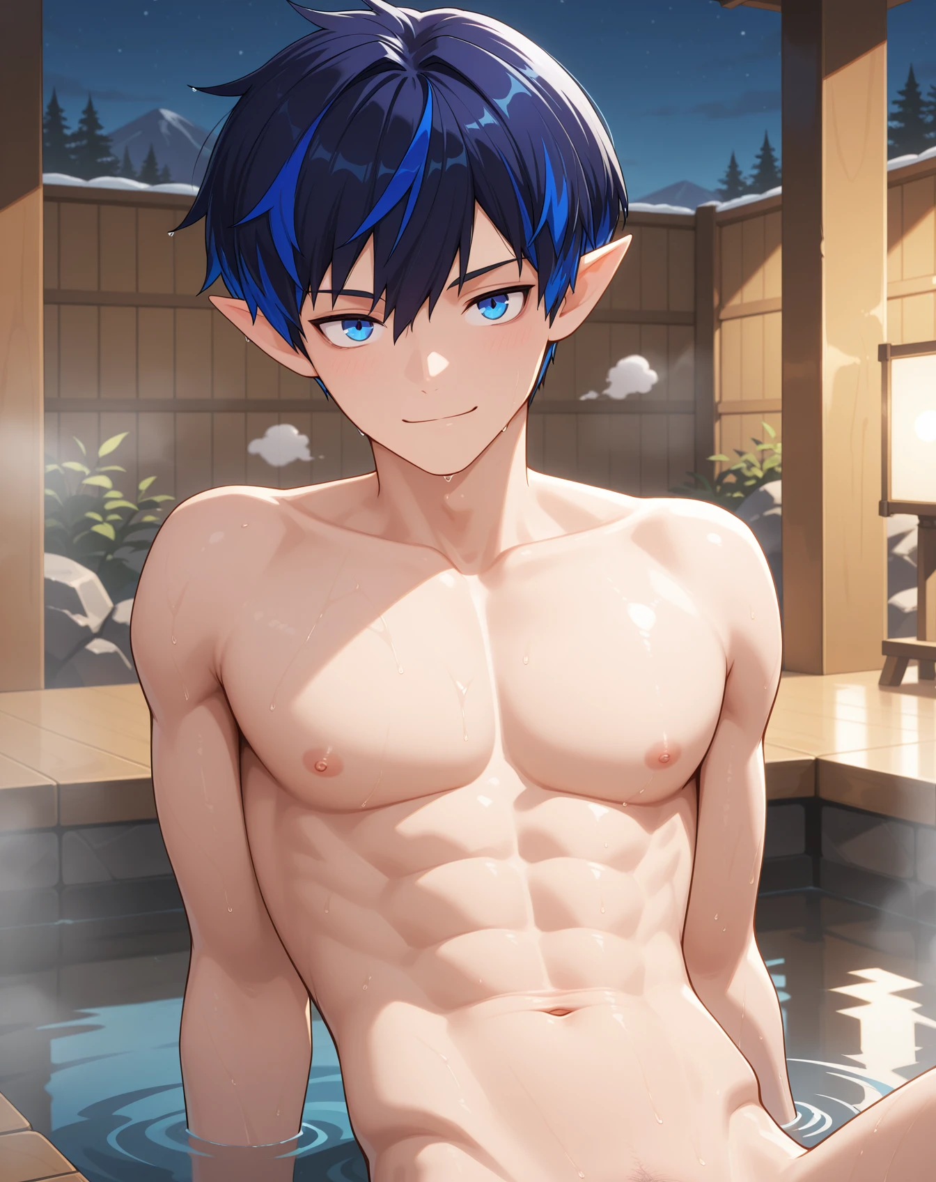 cielbase, pointy ears, blue eyes, black hair,multicolored hair,dark blue hair, two-tone hair, streaked hair,