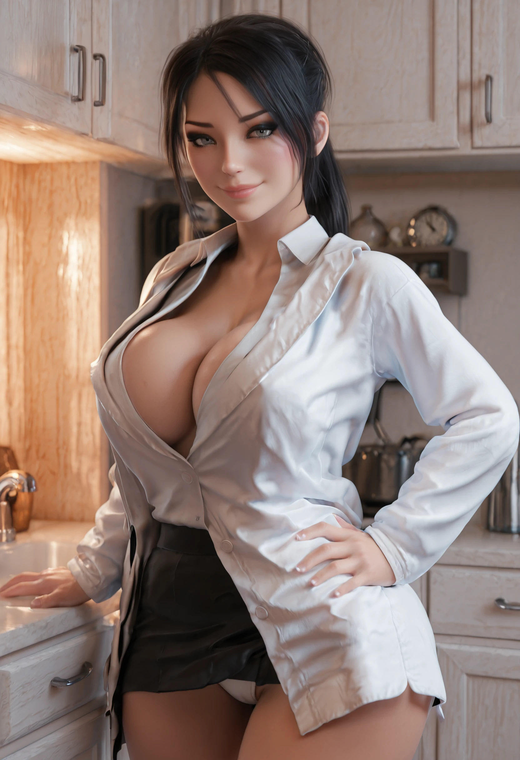 white doctor coat, white collared shirt, black miniskirt, cleavage, black high heels