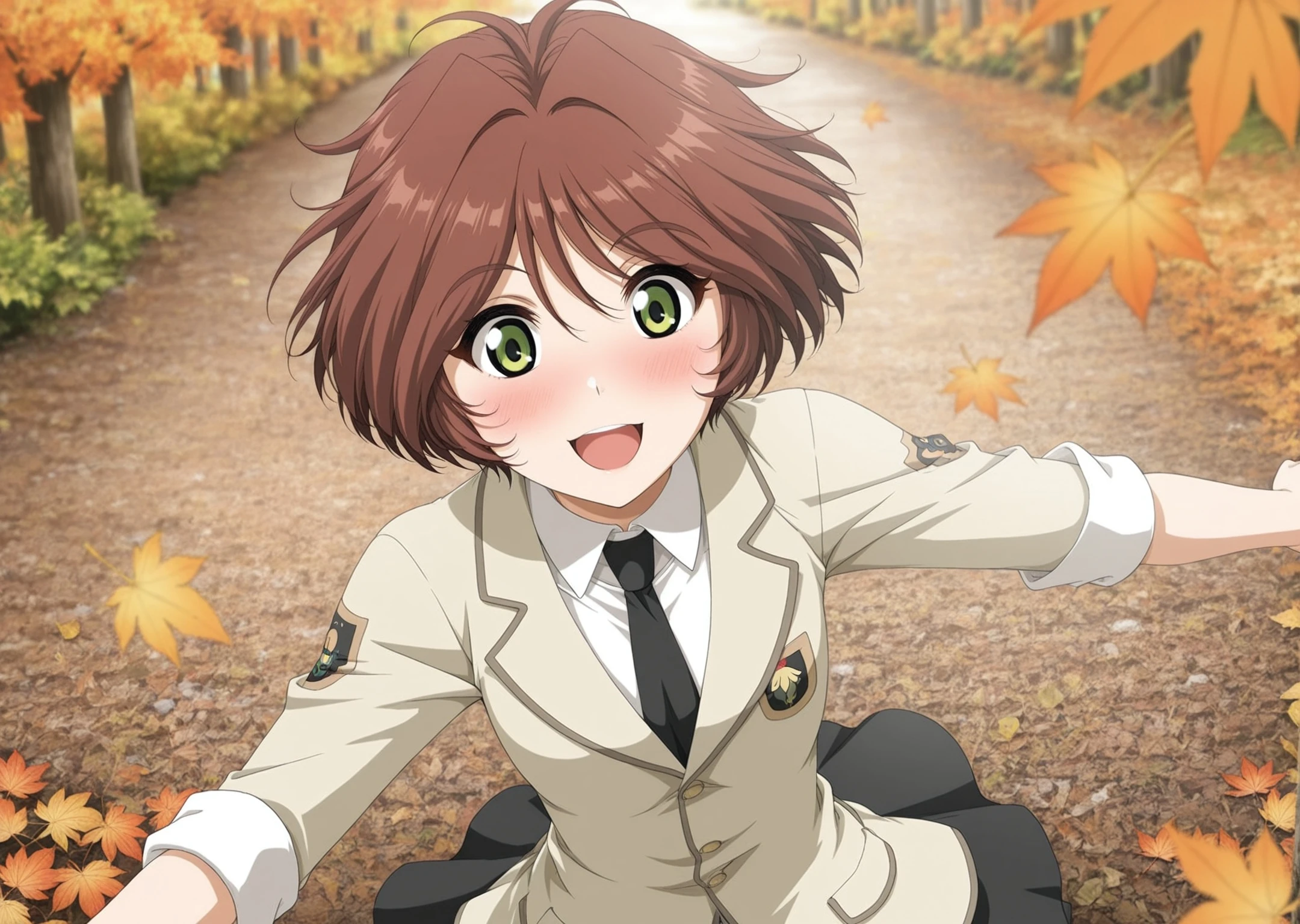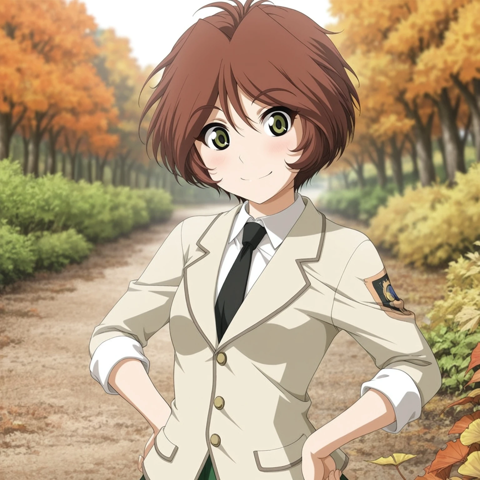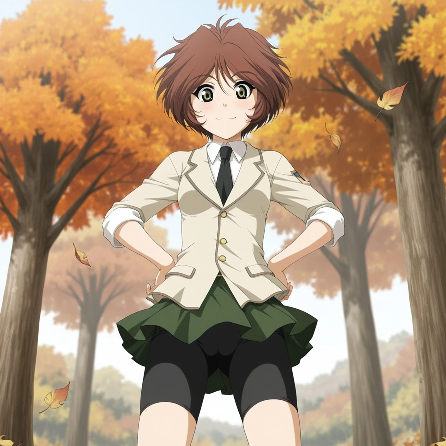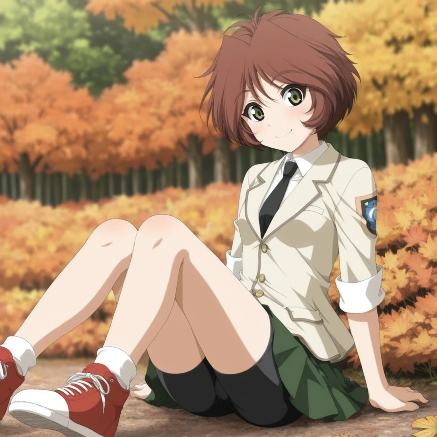 black necktie,beige blazer,sleeves rolled up,emblem,green skirt,bike shorts under skirt,white ankle socks,red sneakers