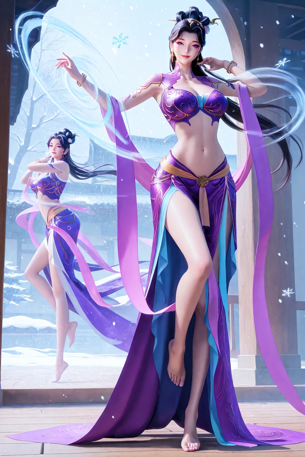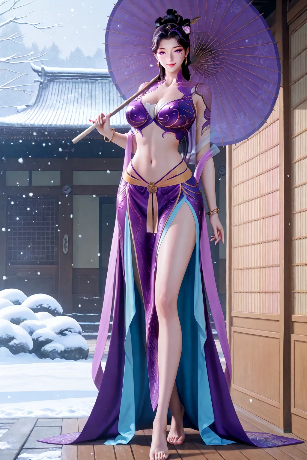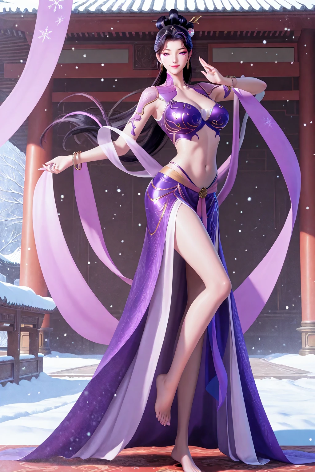fuqingyun, purple eyes, long hair, black hair, purple streaked hair, hair ornament, hair flower, makeup, makeup under eye, eyemakeup, earrings, jewelry, purple top, purple dress, midriff, bracelet, barefoot