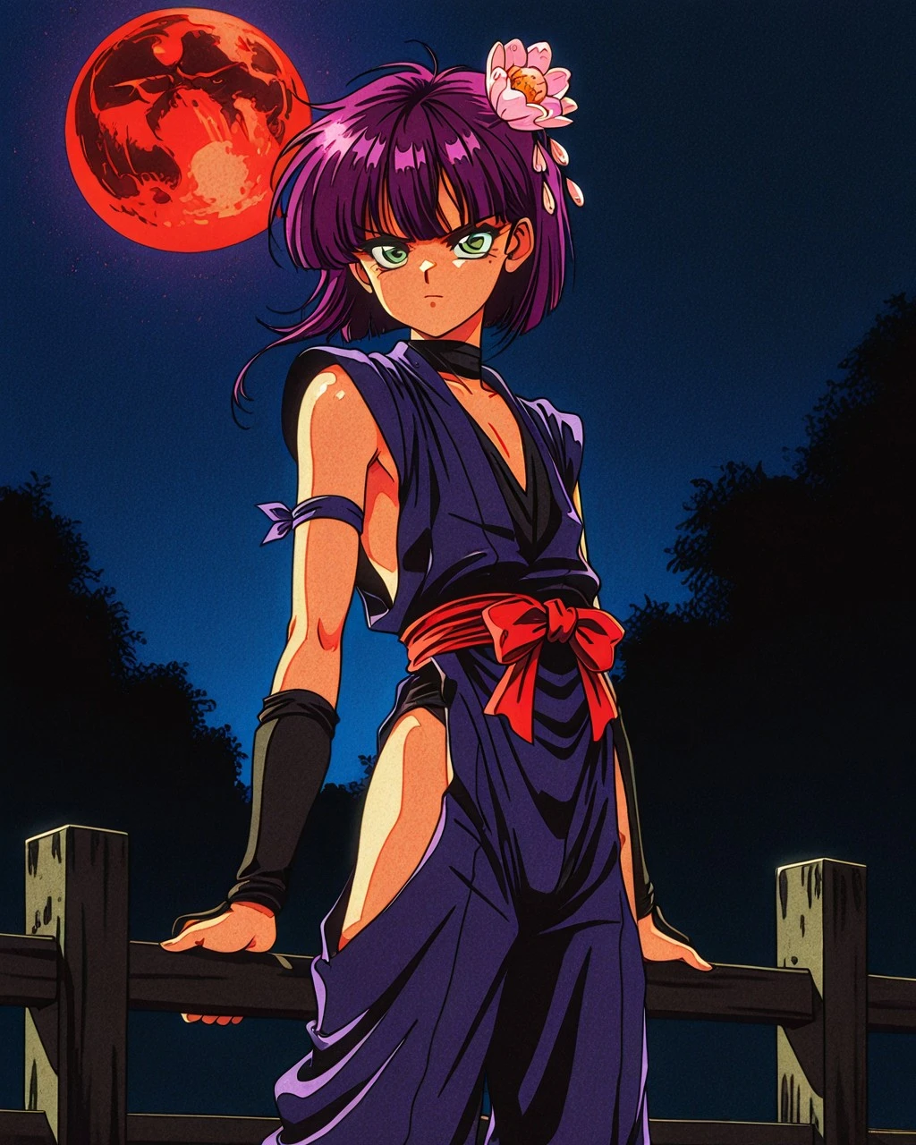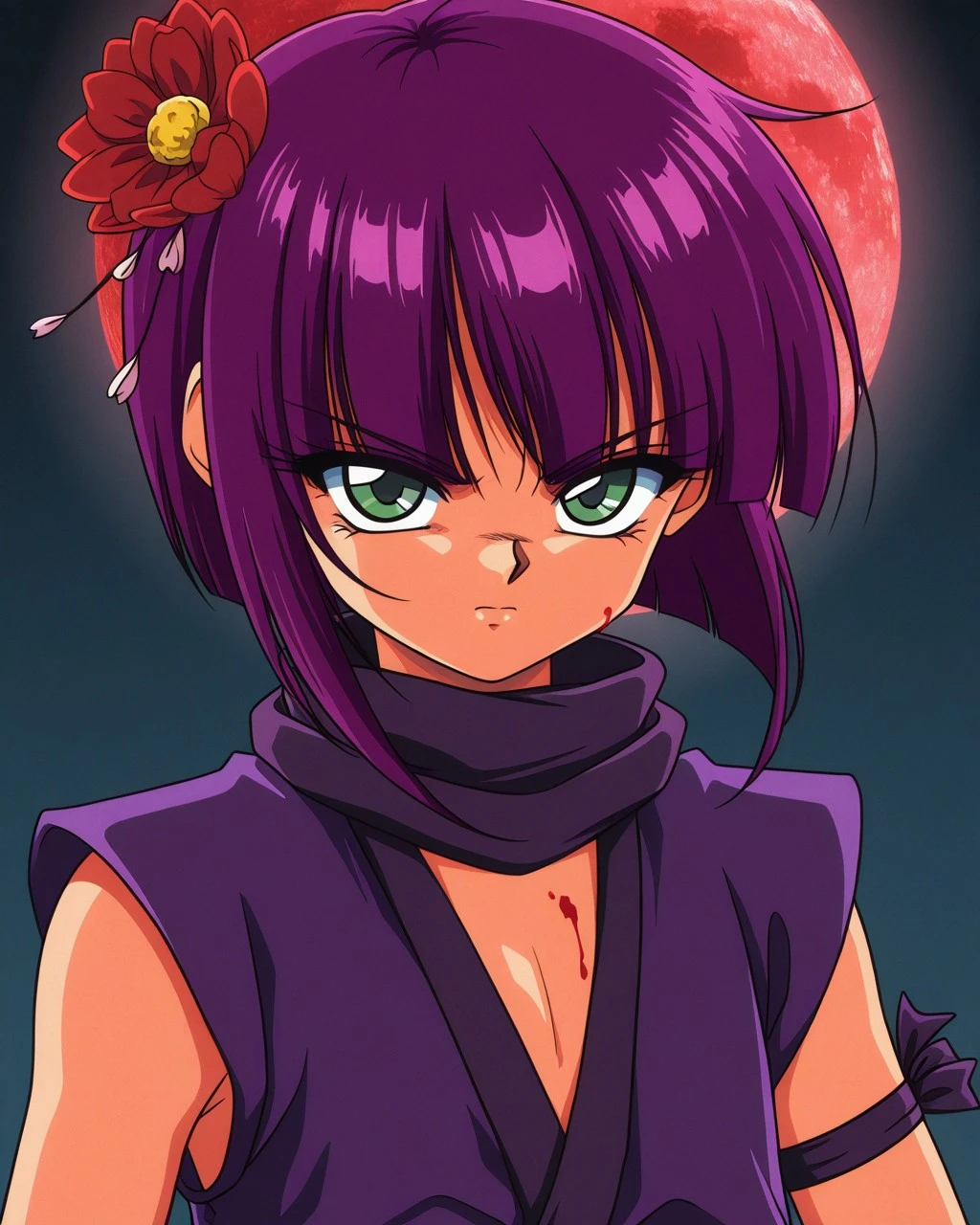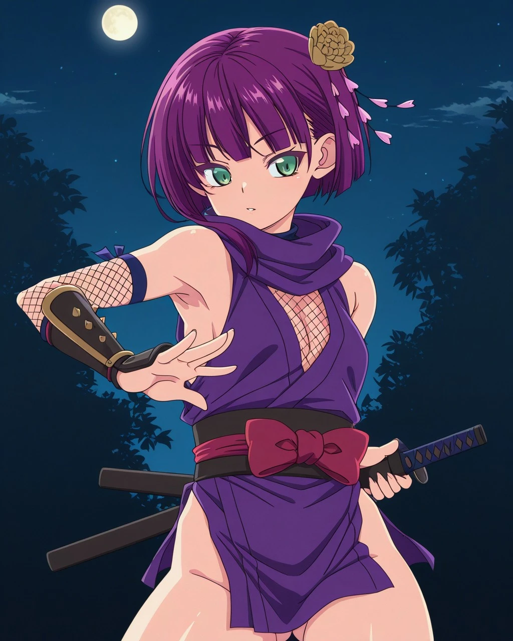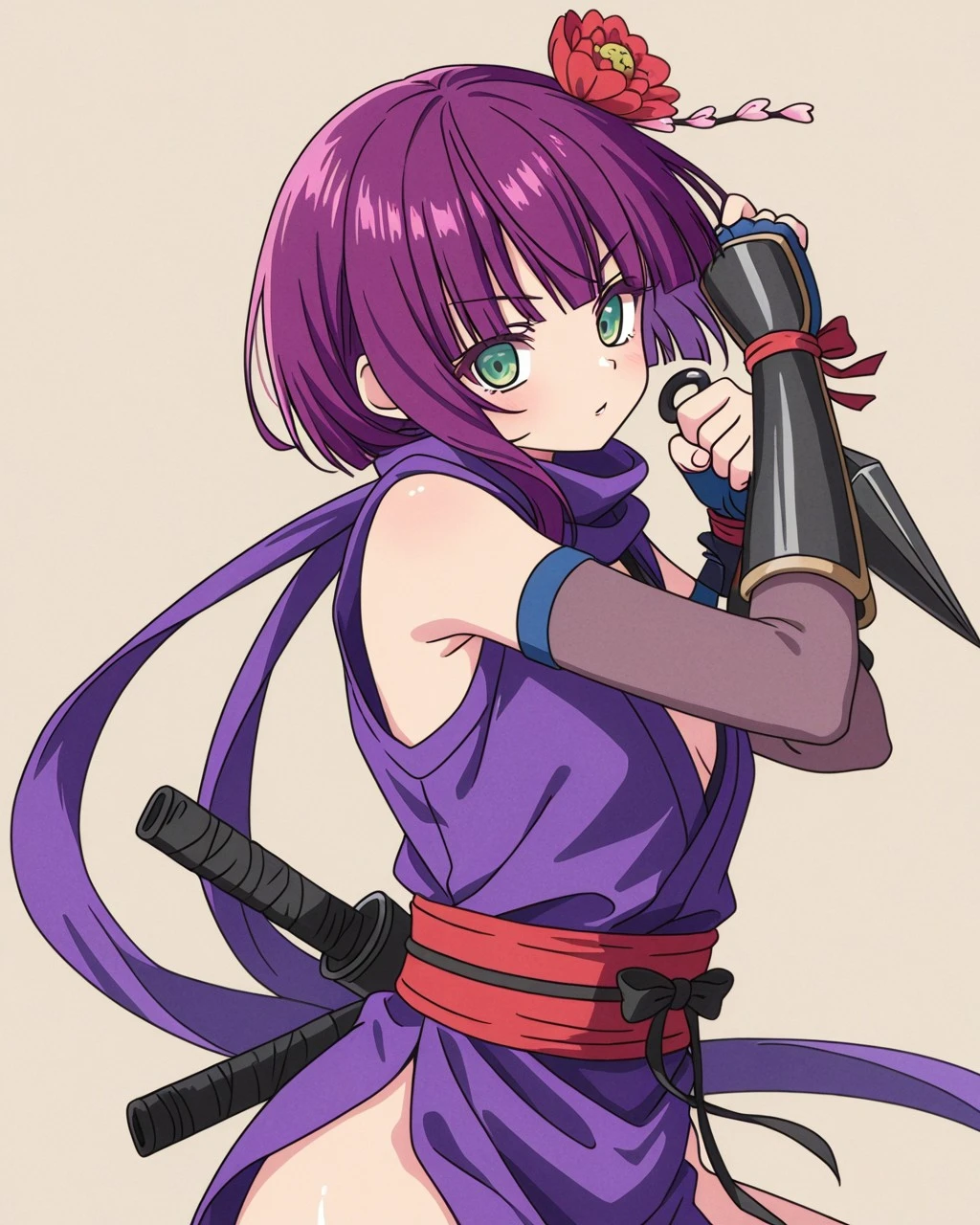 Botan,1girl,hairflower,short hiar,green eyes,ninja,kunai,purple hair,
