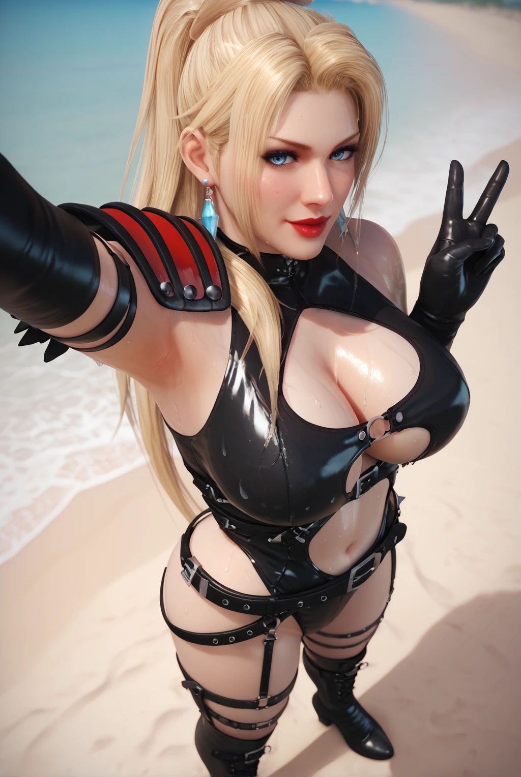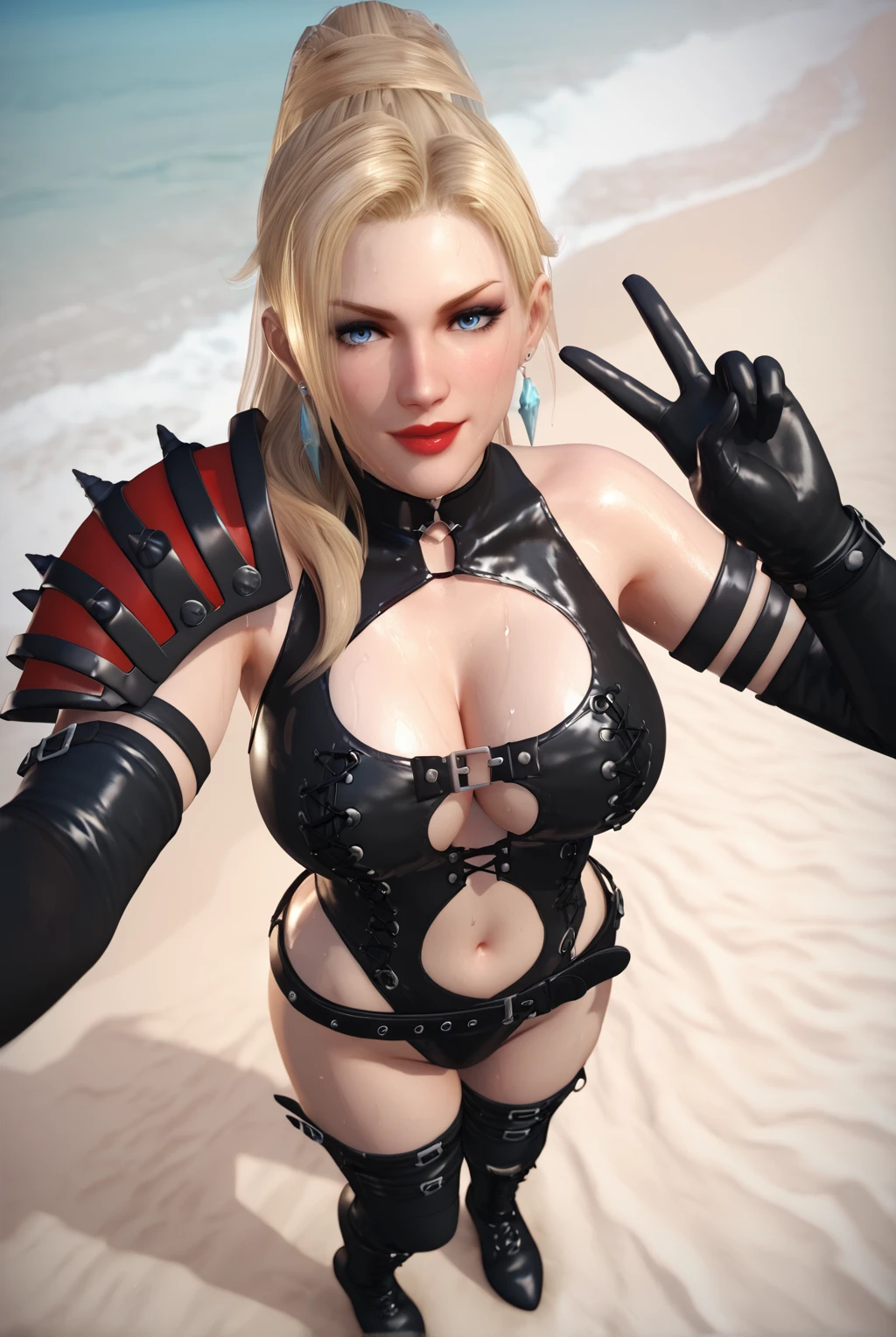 bare shoulders, earrings, black gloves, elbow gloves, belt, black thighhighs, armor, clothing cutout, makeup, black thigh boots, cleavage cutout, shoulder armor, black leotard, pauldrons, center opening, navel cutout, leather, latex, shoulder spikes, dominatrix, bondage outfit, battle gear outfit, battle outfit, single shoulder pad