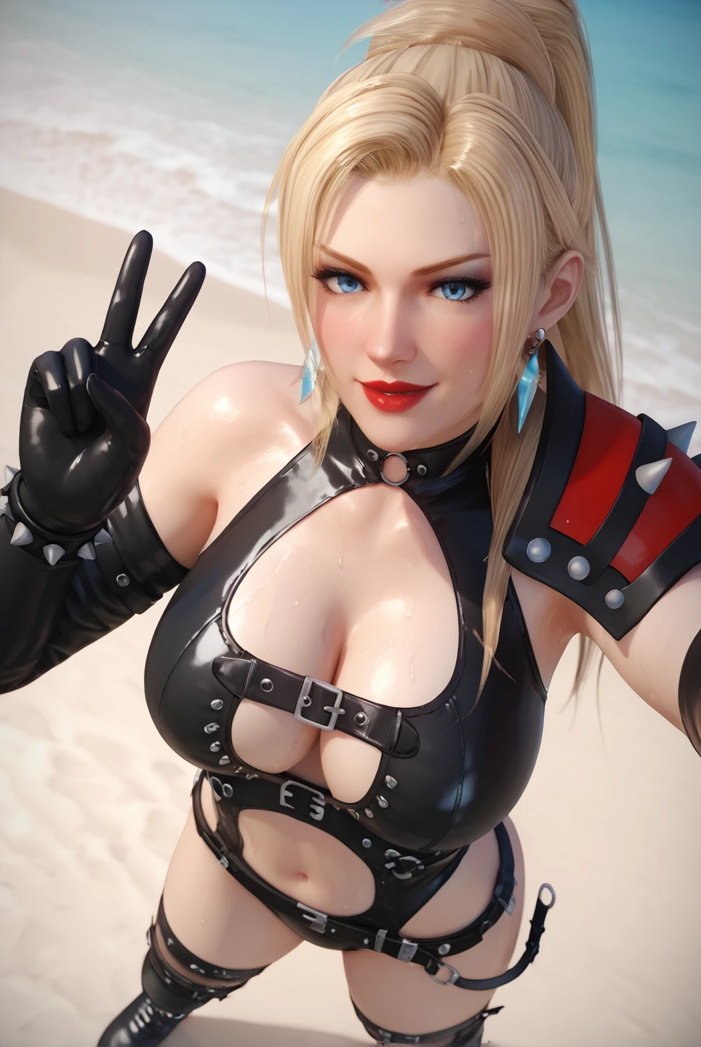 Rachel, long hair, blue eyes, blonde hair, large breasts, bare shoulders, ponytail, high ponytail, red lips