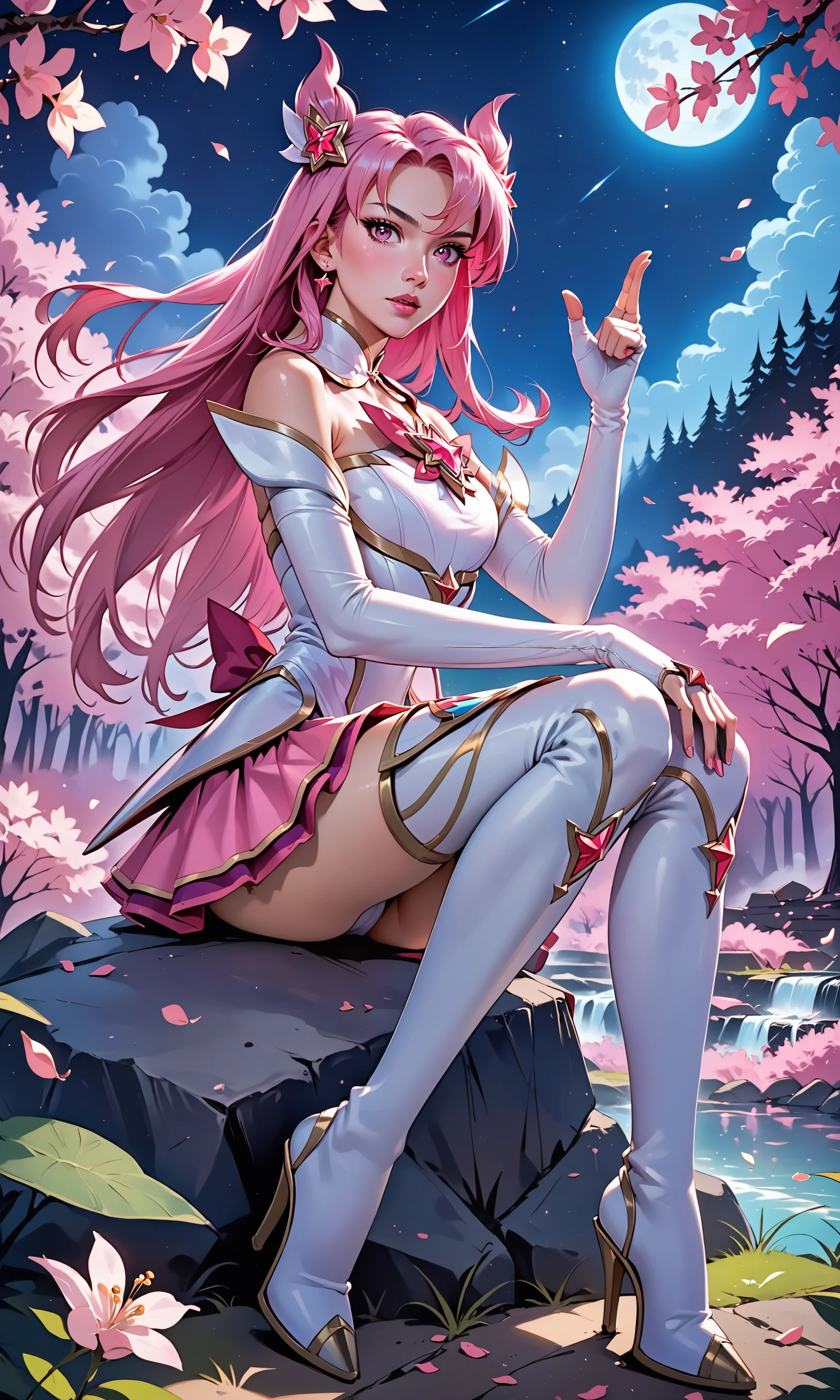 night, midnight, 1am, moon, high heels, cherry blossom forest, sitting on rock