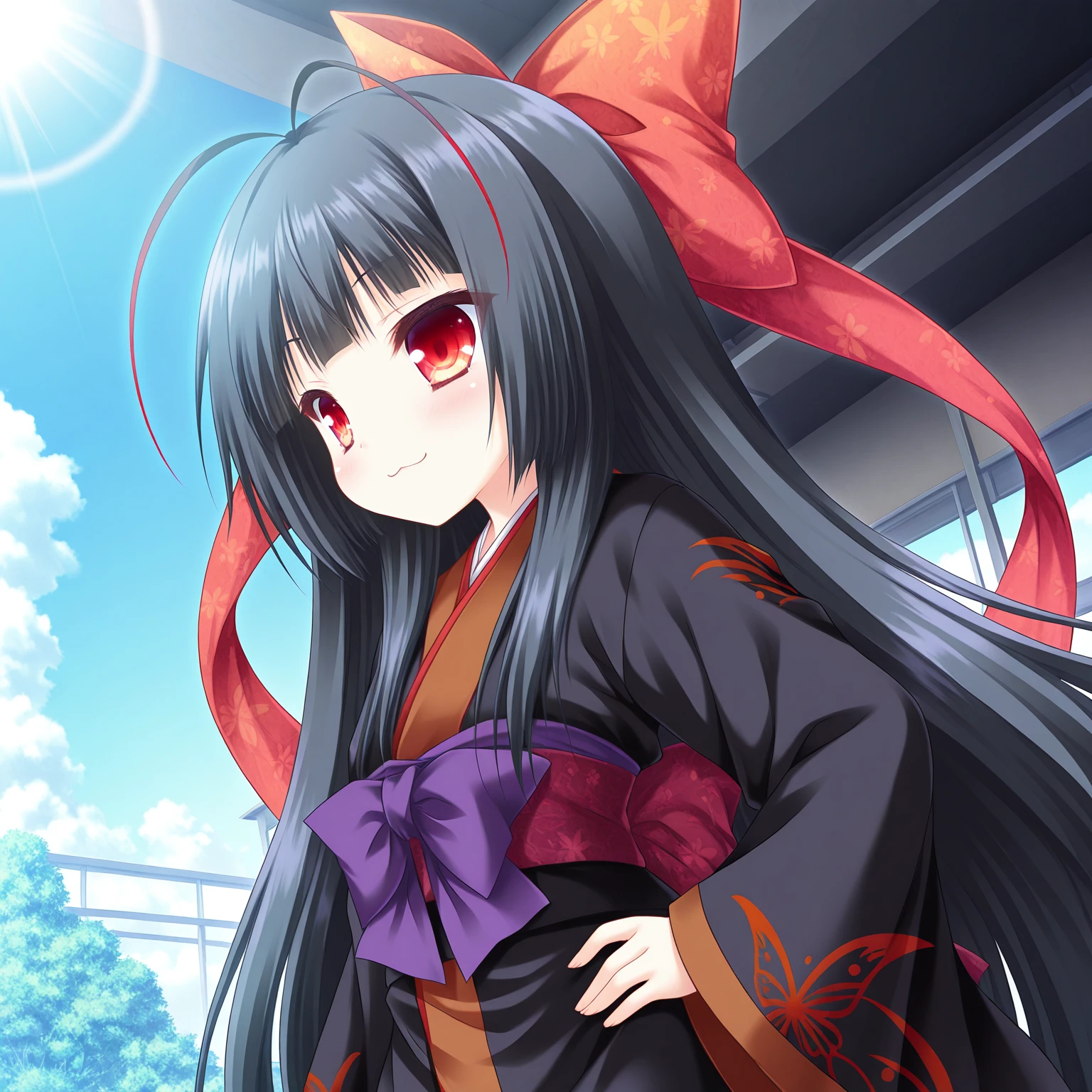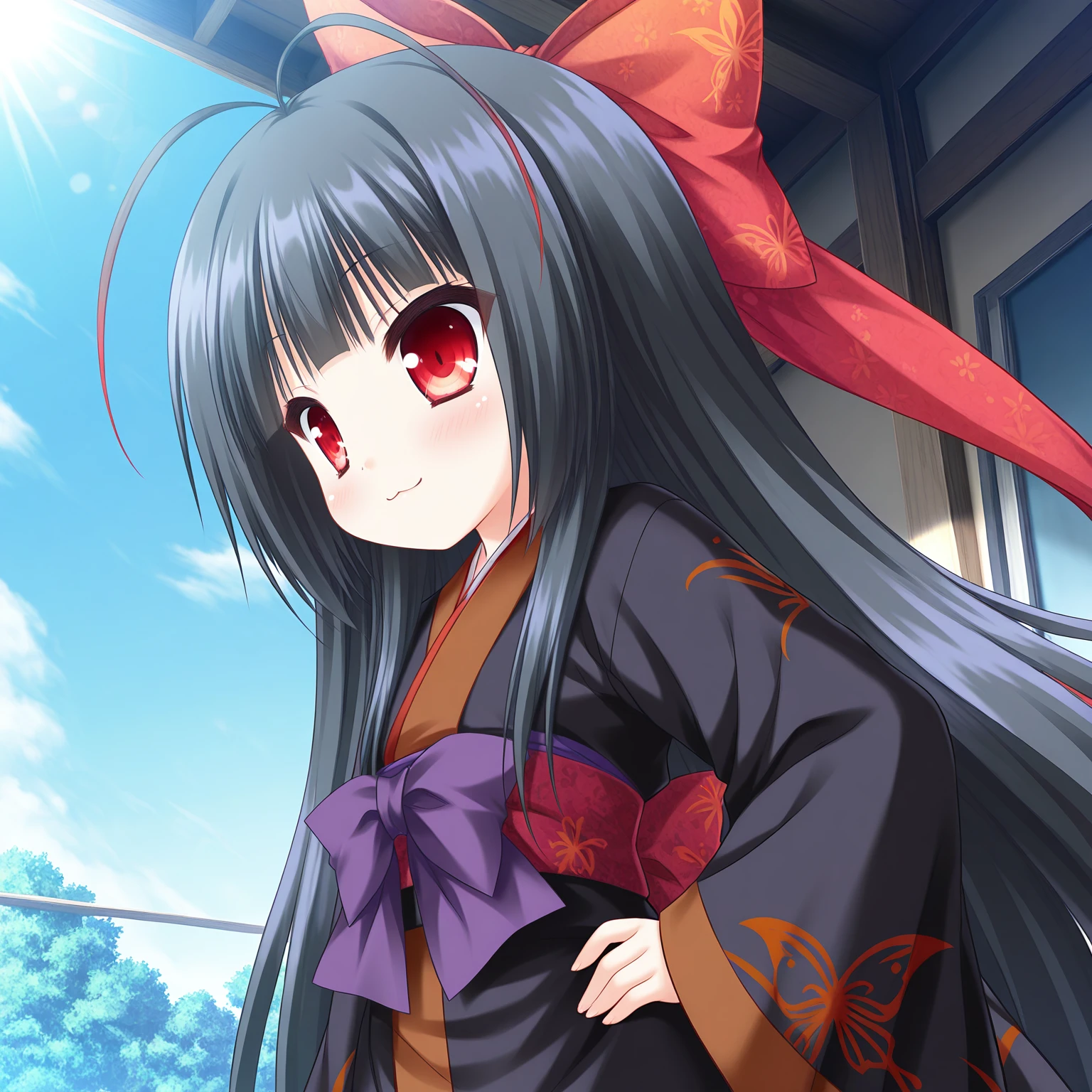 black hair, very long hair, blunt bangs, gradient antenna hair,floral print hair bow, floral print hair ribbon, japanese clothes, black kimono, butterfly print kimono, brown lapels, brown trim,long sleeves, wide sleeves, sleeves past wrists,red back bow, red sash, purple waist bow,white tabi, zouri,