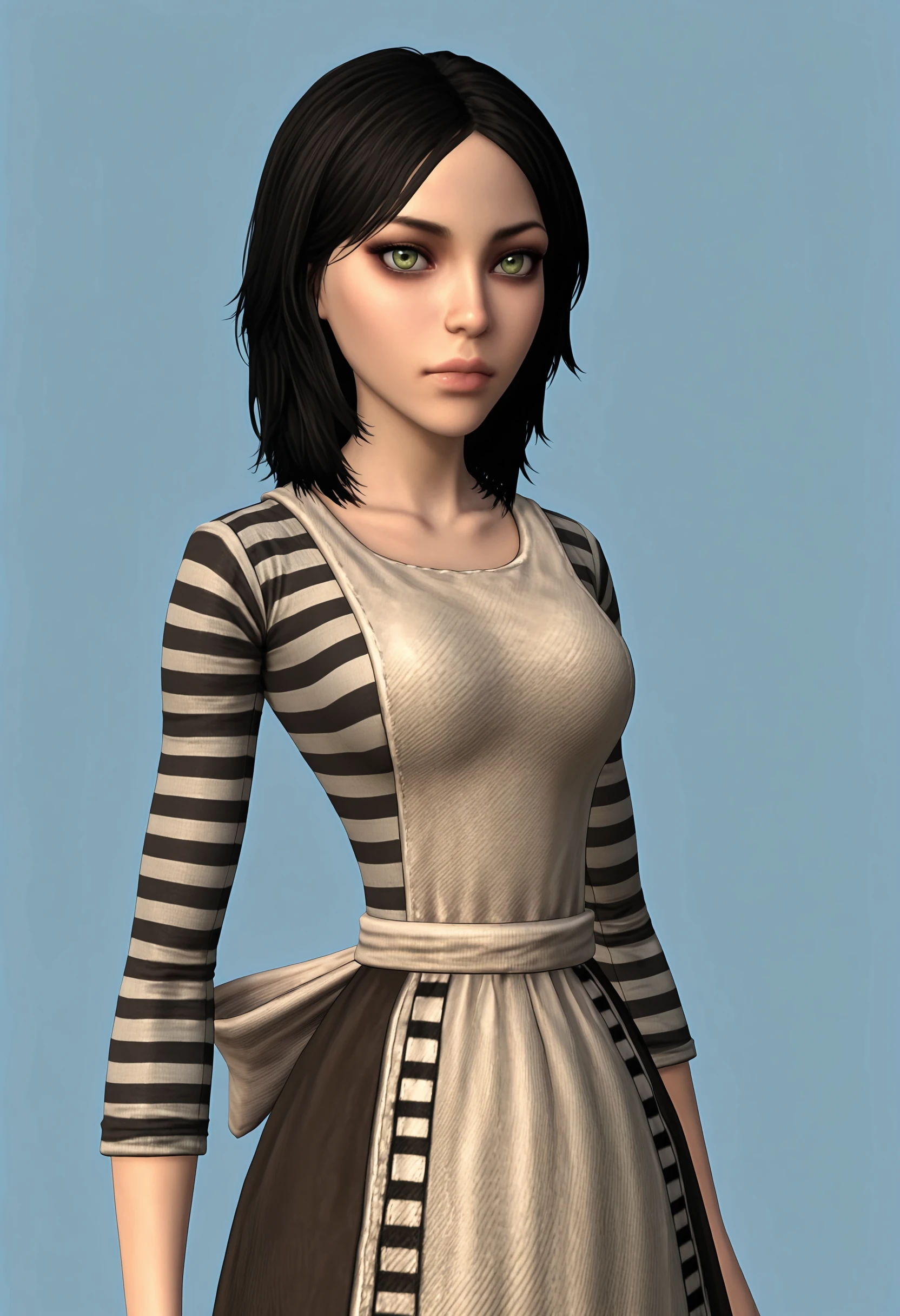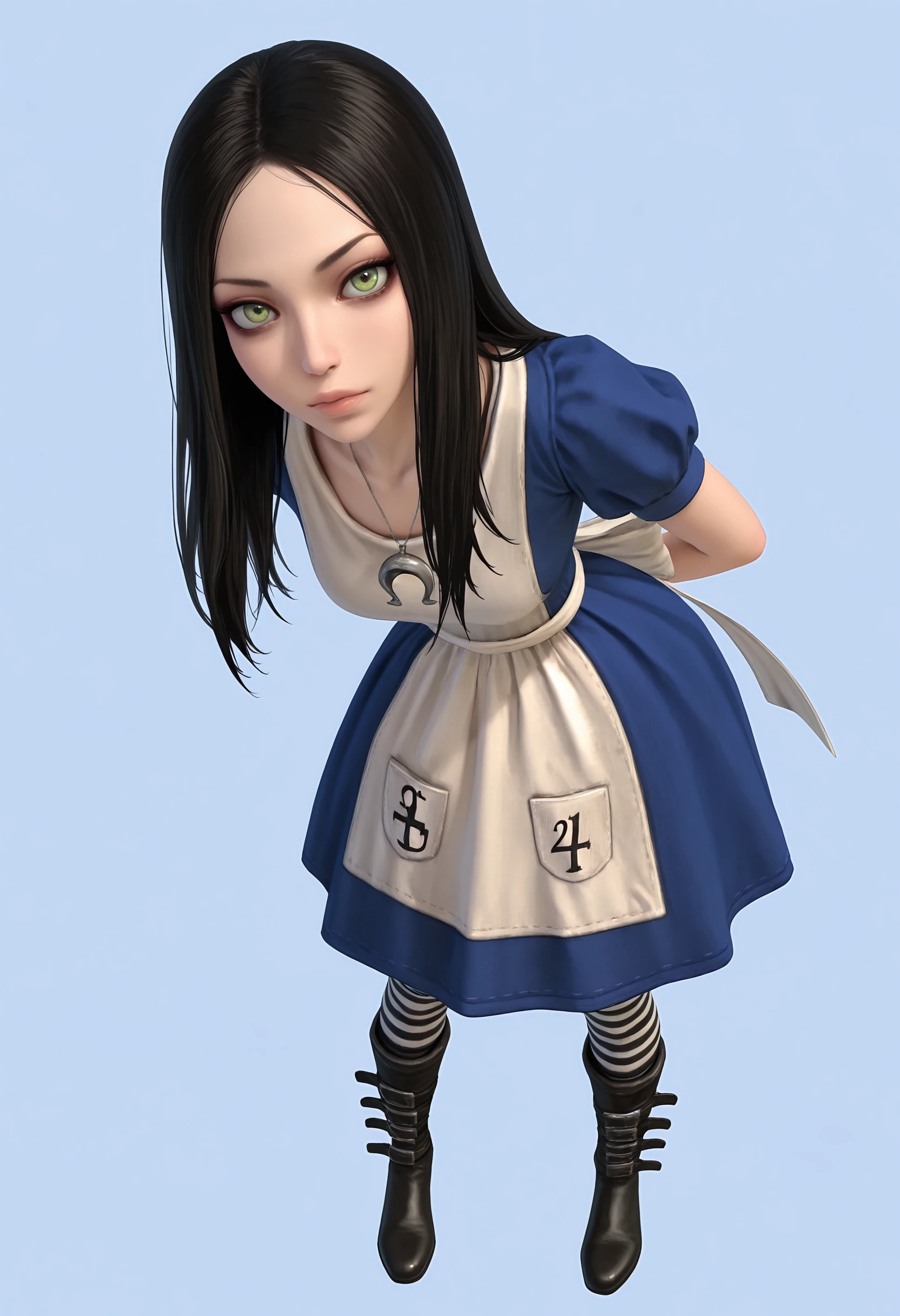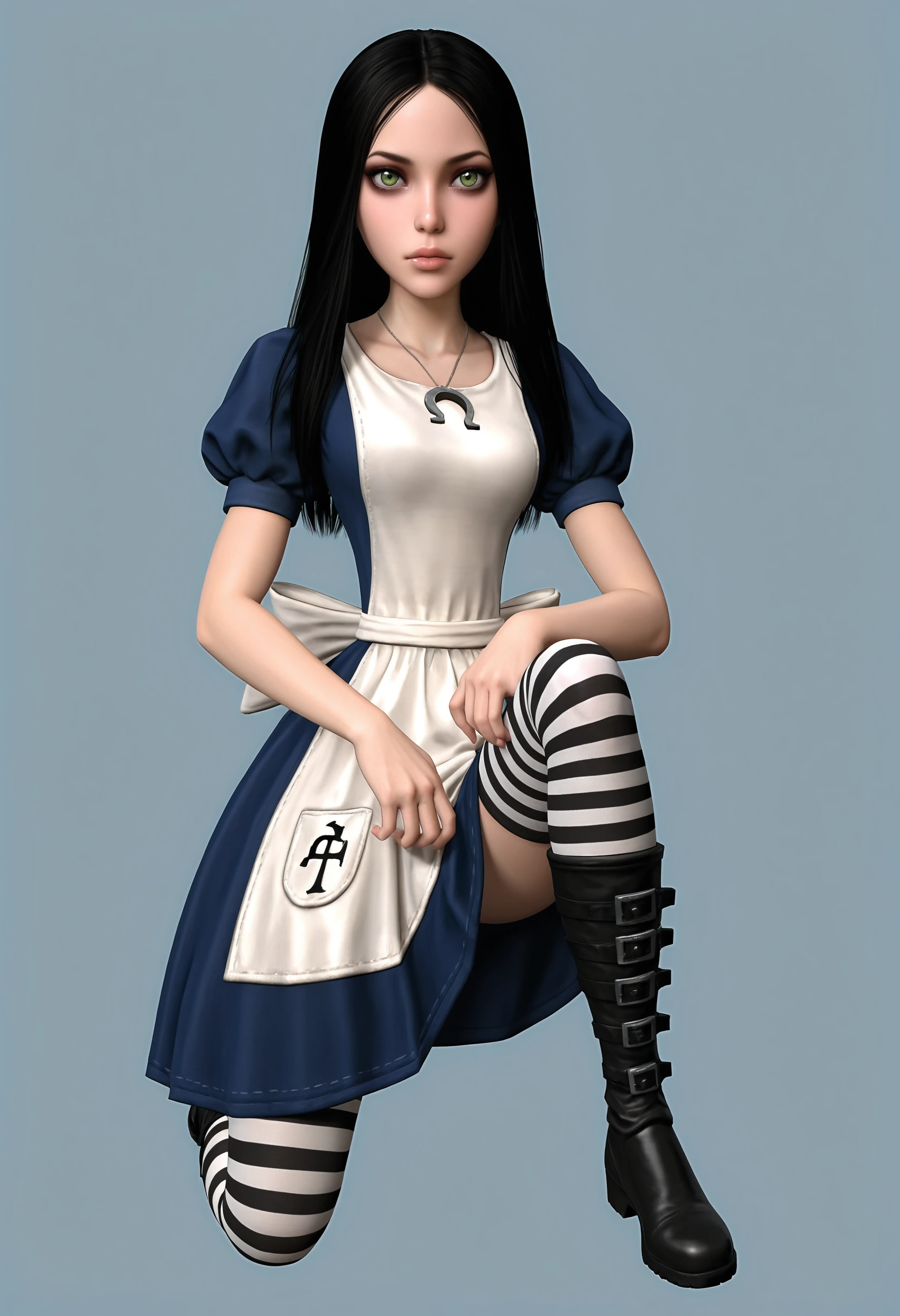 • Alice: alic1, green eyes, long hair, necklace, dress, apron, striped thighhighs, boots