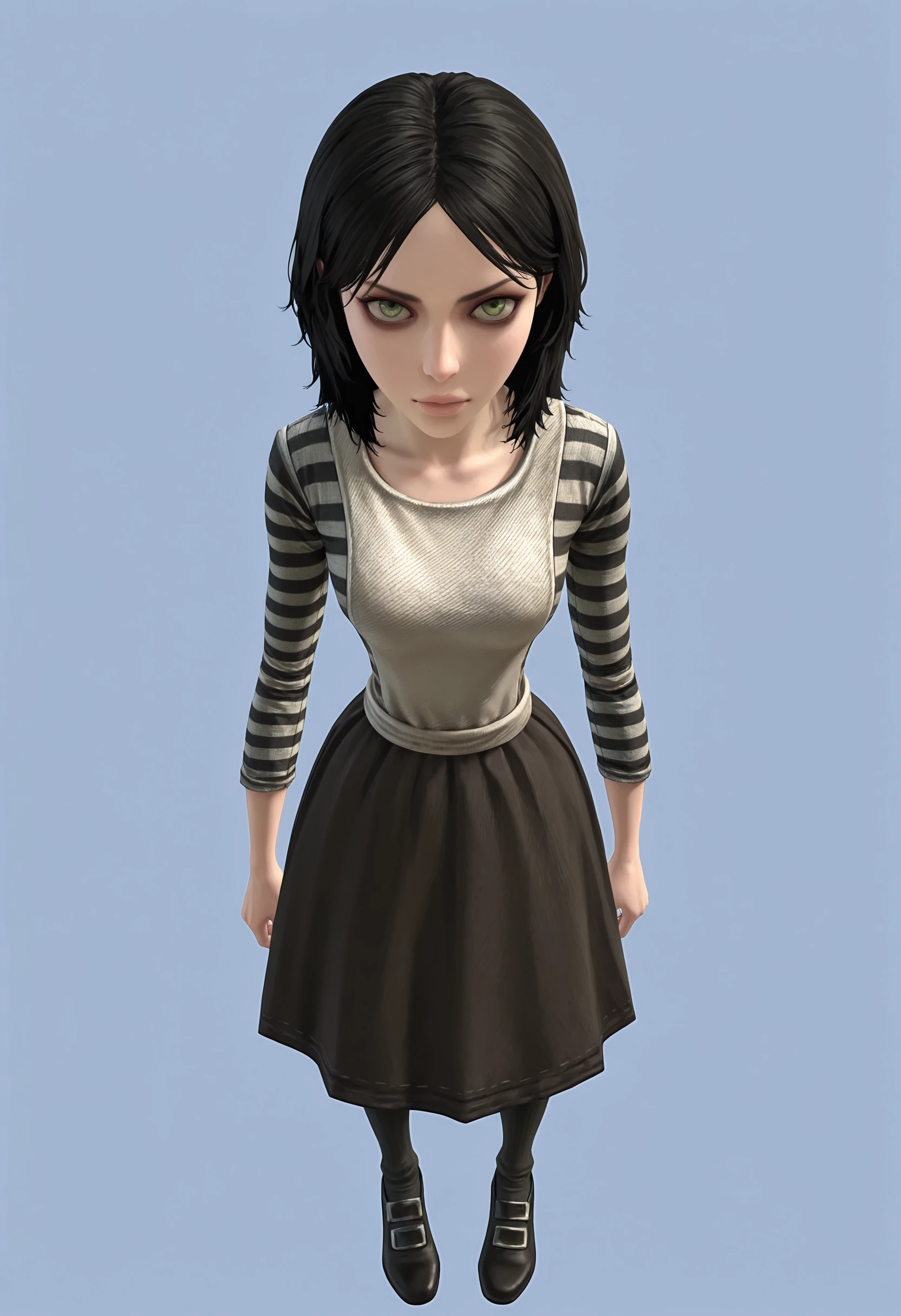• London Alice: alic2, green eyes, medium hair, striped shirt, apron, skirt, thighhighs, shoes