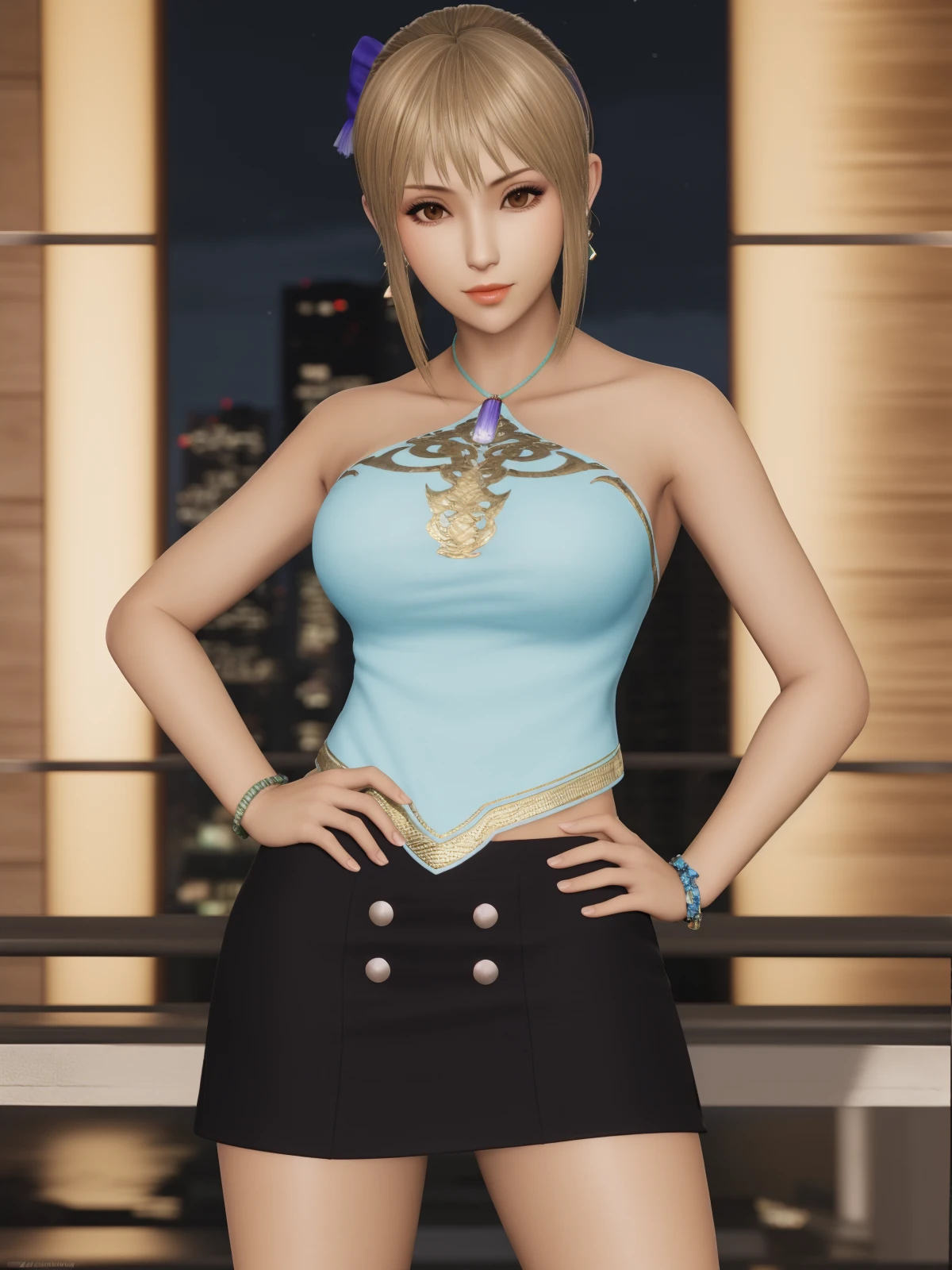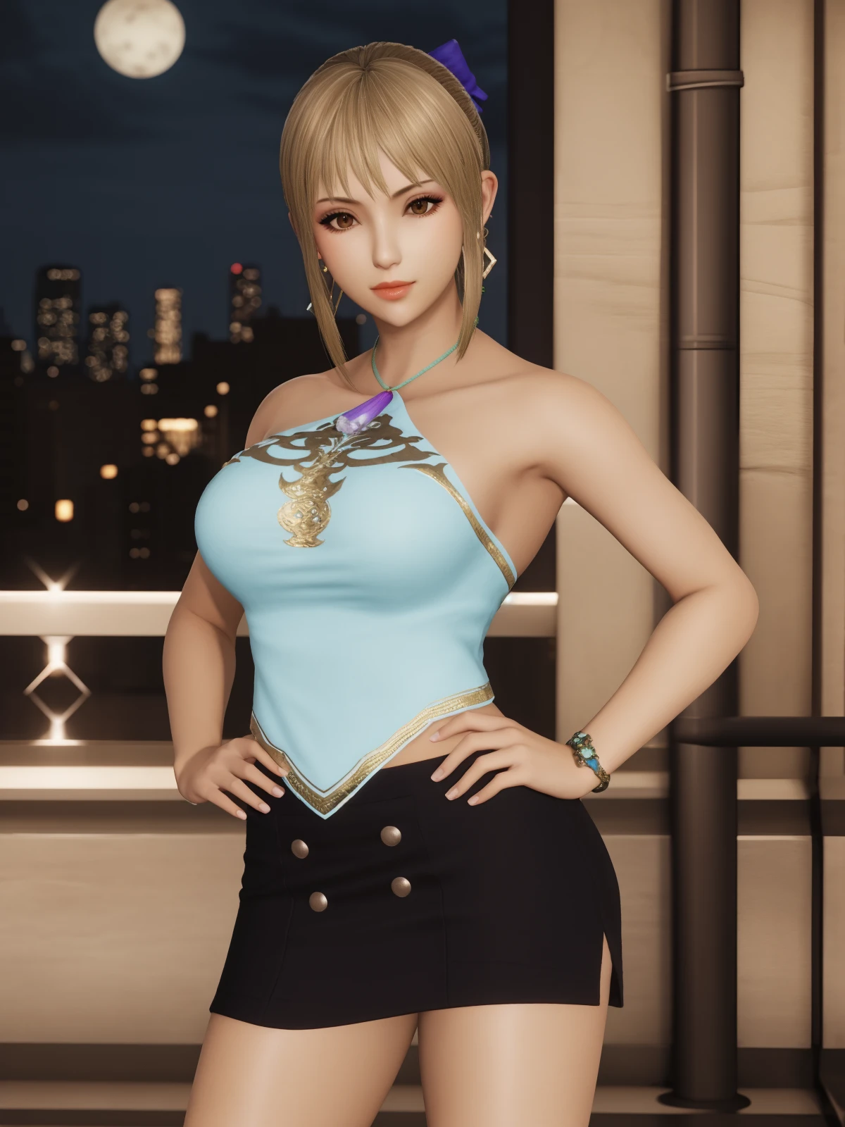 ZSGWSwangyuanjiDD, 1girl, solo, pencil skirt, jewelry, blonde hair, earrings, brown eyes, bare shoulders, bracelet, short hair, lips,halterneck, cityscape, night,cowboy shot, side ponytail, hand on hip, looking at viewer, (light smile:0.7),