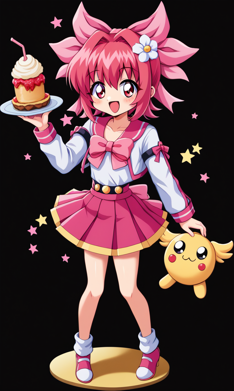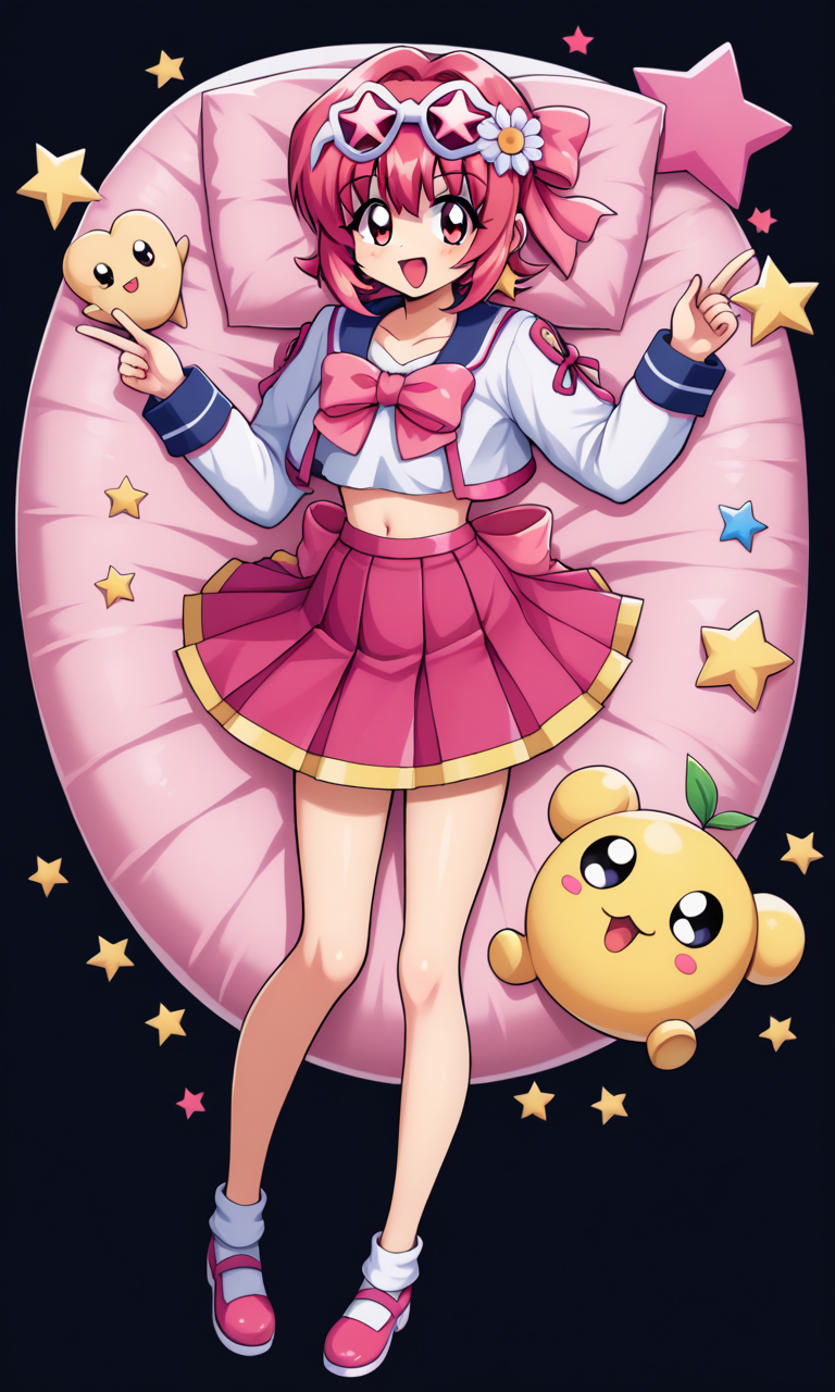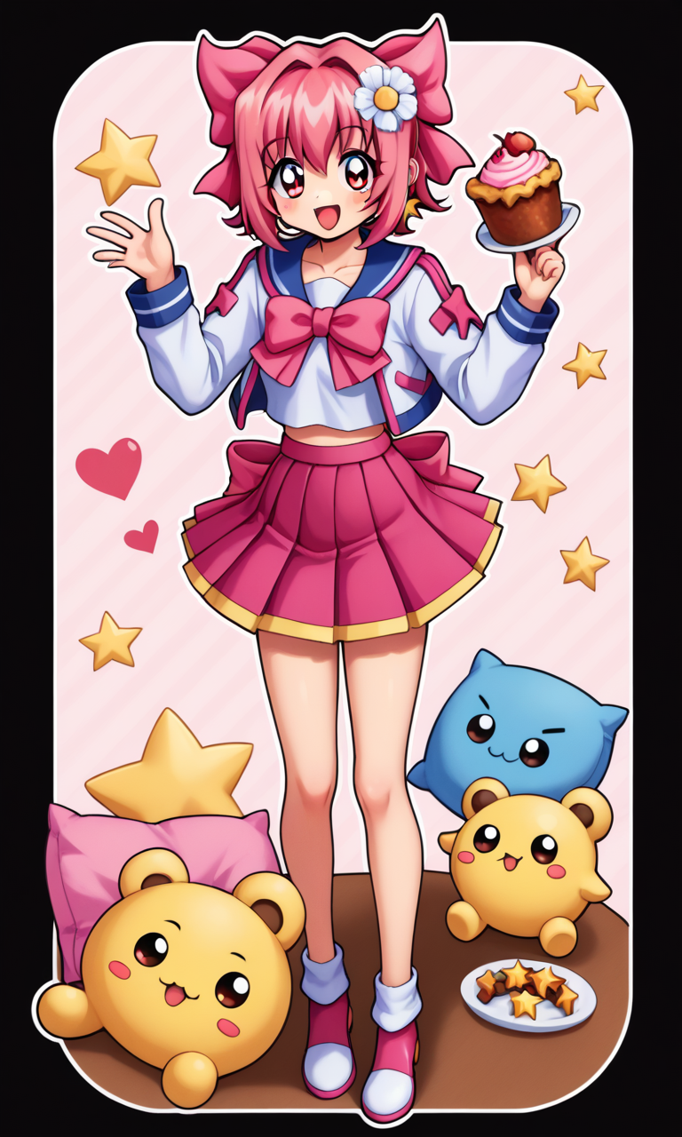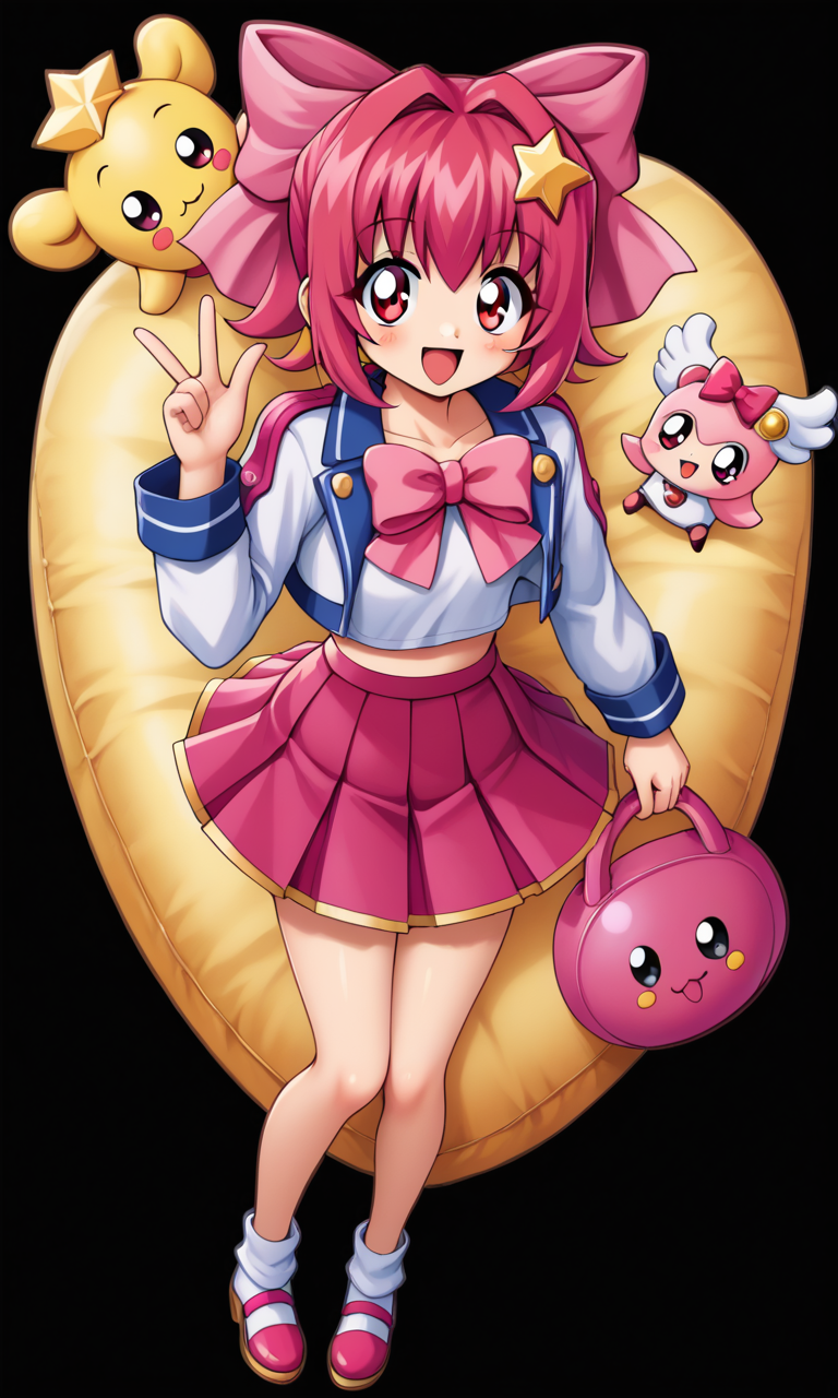 hanakoganeihibari, red hair, pink skirt, mini skirt, short hair, pink bow, pleated skirt, red eyes, hair ribbon, pink hair ribbon, white shirt, cropped jacket, long sleeves, collarbone, looking at viewer, skirt, retro artstyle, 1990s (style),