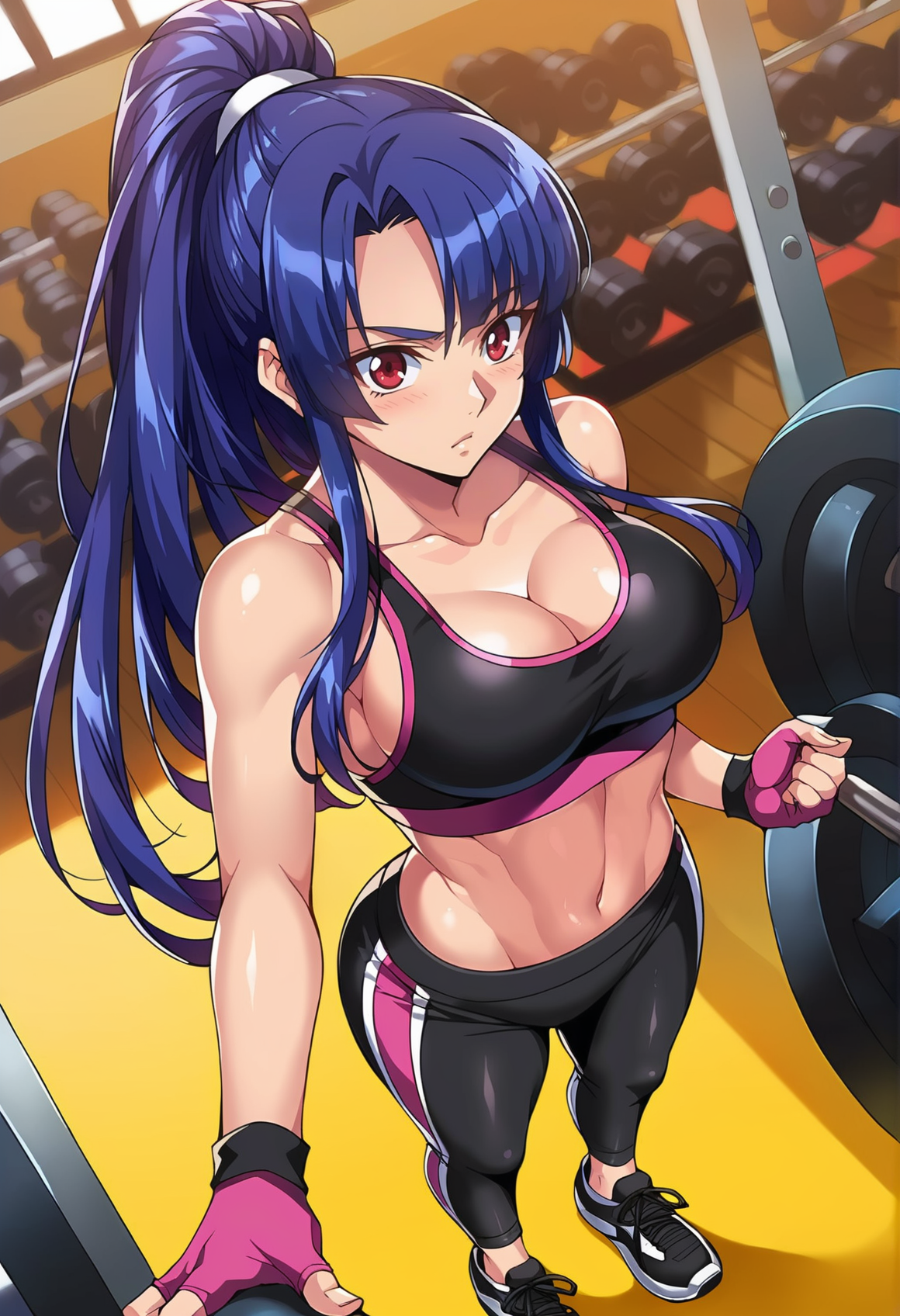ymdi,black sports bra,navel,fingerless gloves,black sneakers,ponytail,midriff,cleavage,pink gloves,sportswear,high ponytail,bare shoulders,black pants,collarbone,
