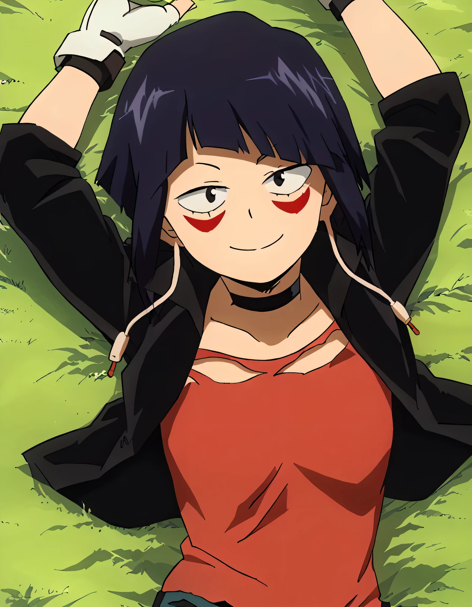 kyokajiro_mha, three-quarter shot, earlobes, earphone plugs, headphones, red face markings, black choker, dark leather jacket, ripped shirt, jeans, boots, fingerless_bulk_gloves