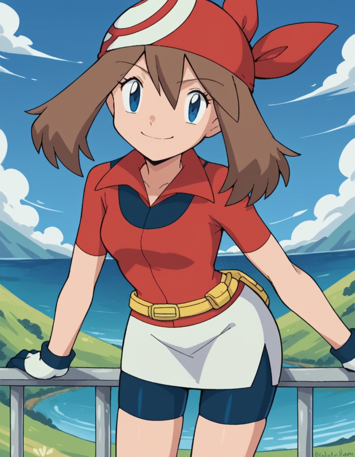 <lora:pokemon-may-anime-ponyxl-lora-nochekaiser:1>, pokemonmay, blue eyes, brown hair, bandana, long hair, red bandana, twintails, hair between eyes,
