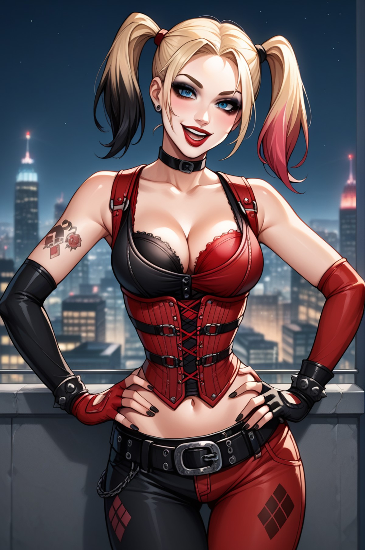 HarleyCity, twintails, colored tips, makeup, black eyeshadow, multicolored clothes, asymmetrical clothes, bustier, bra, lboots, midriff, cleavage, elbow fingerless gloves