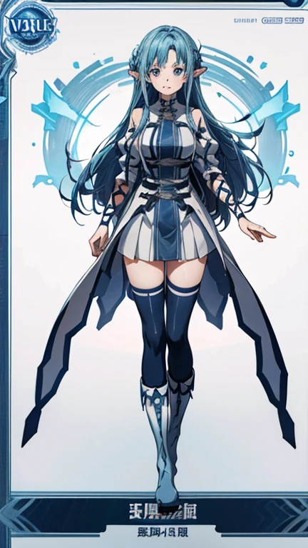 asuna \(sao-alo\), 1girl, blue hair, solo, thighhighs, white footwear, long hair, pointy ears, dress, zettai ryouiki, blue eyes, blue legwear braid