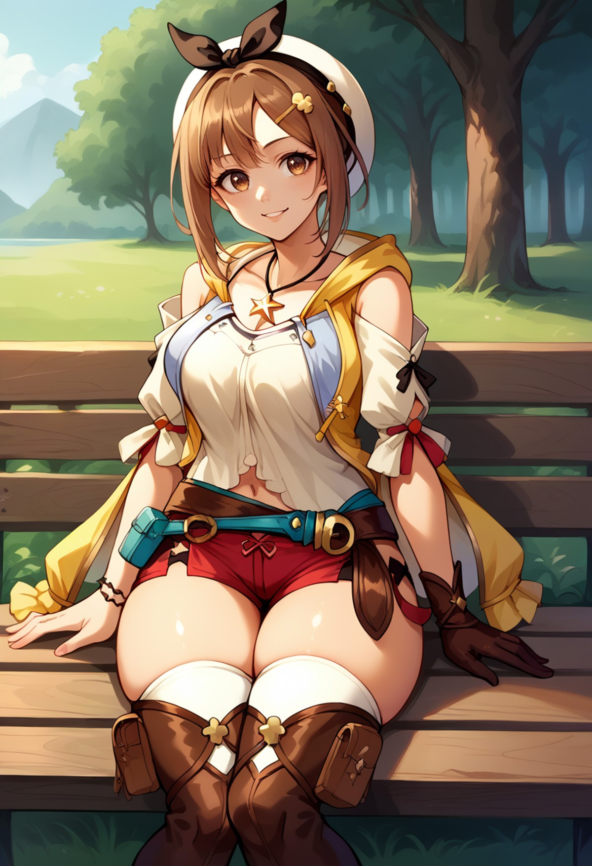 RyzaFirst, short hair, white beret, black bow hairband, hairclip, star necklace, yellow jacket, sleeveless jacket, white shirt, detached sleeves, navel, brown glove, single glove, brown belt, red shorts, thigh pouch, white thighhighs, brown thigh bootsSecond Game: