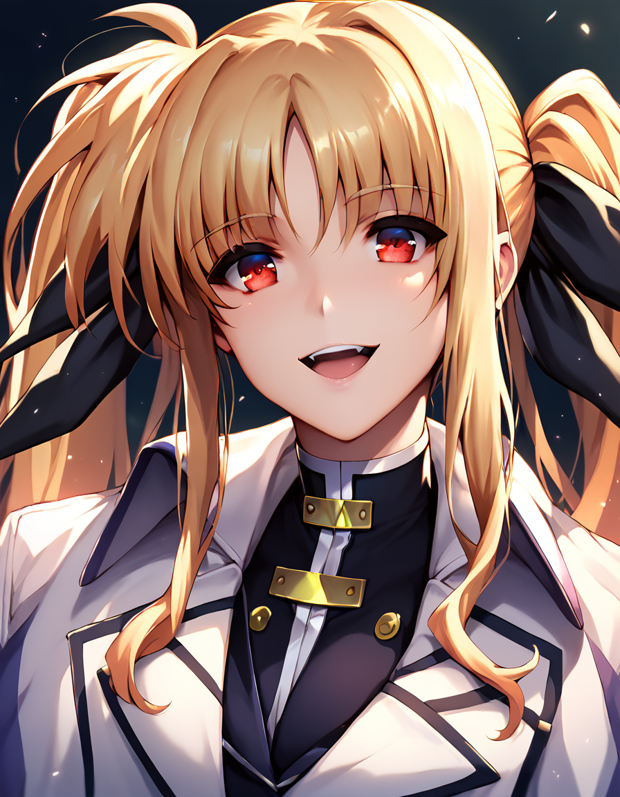 fate testarossa, long hair, blonde hair, red eyes, twintails, hair ribbon,