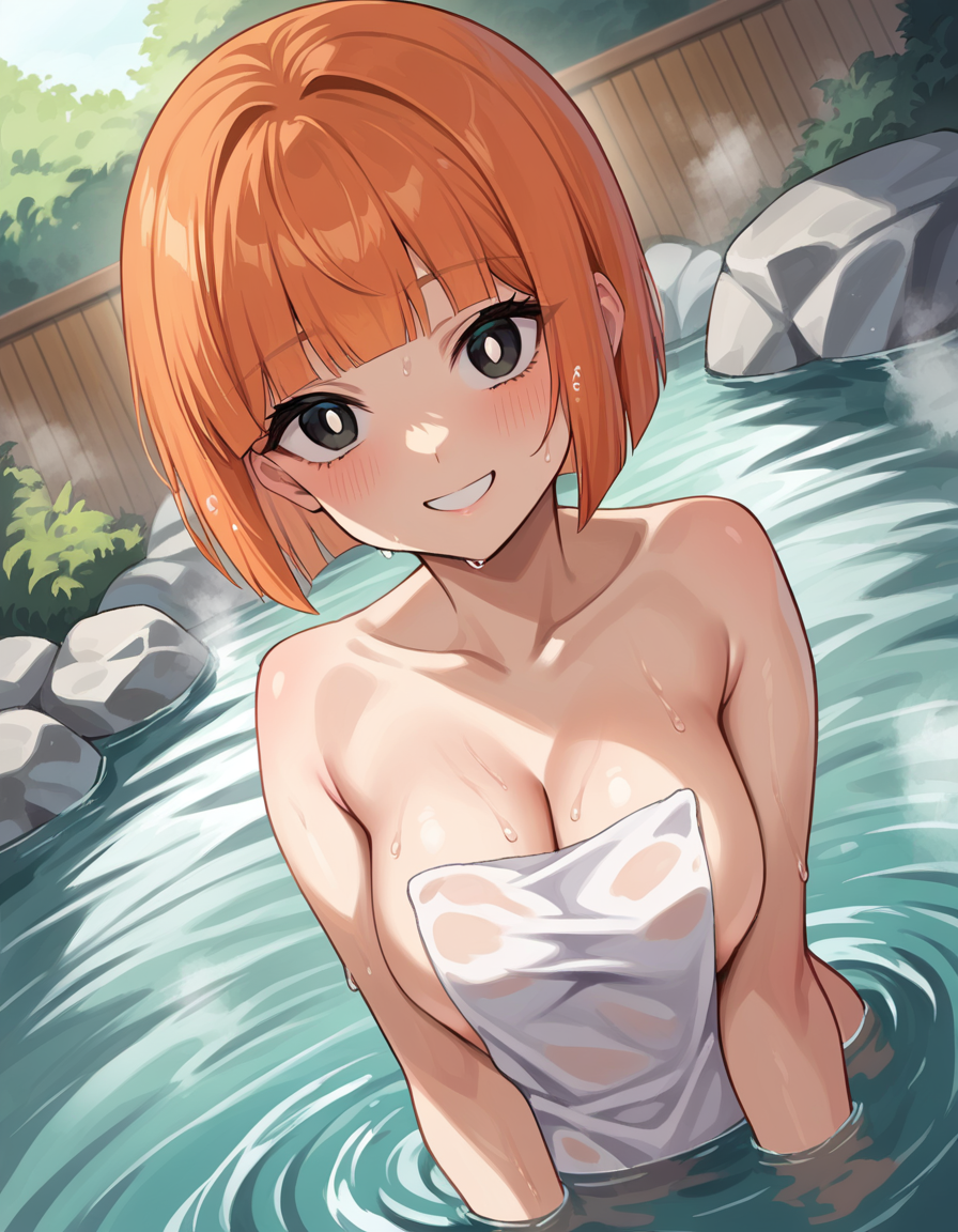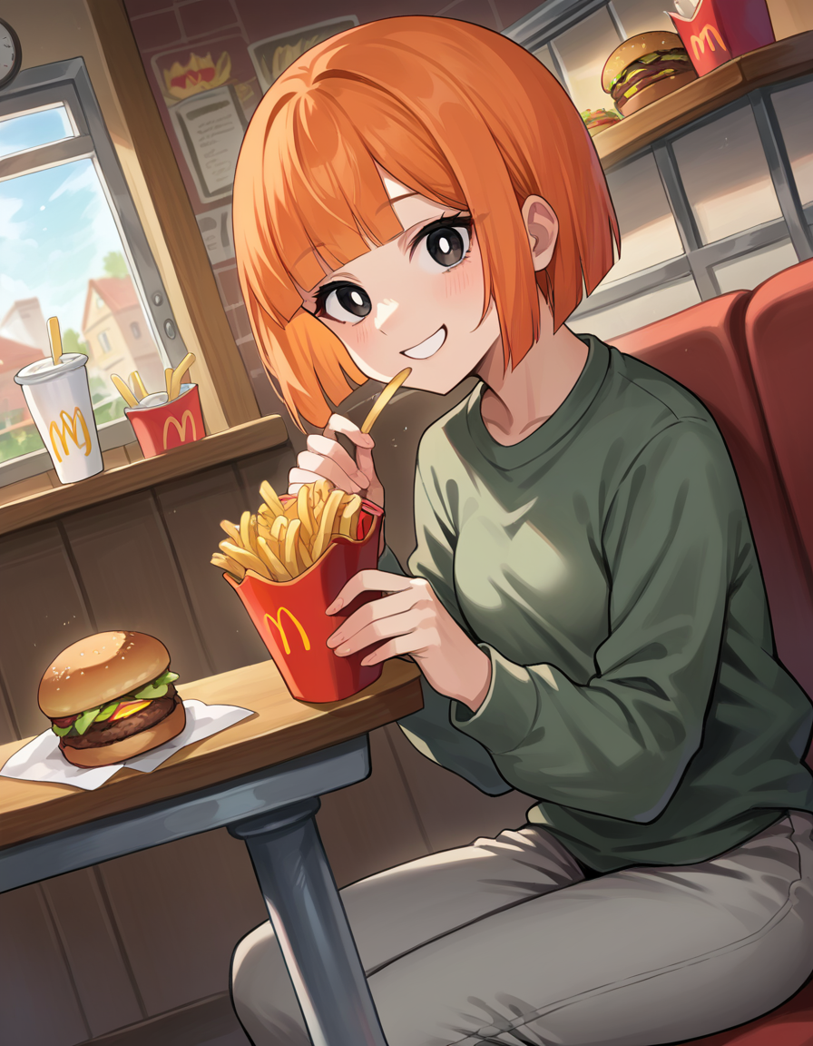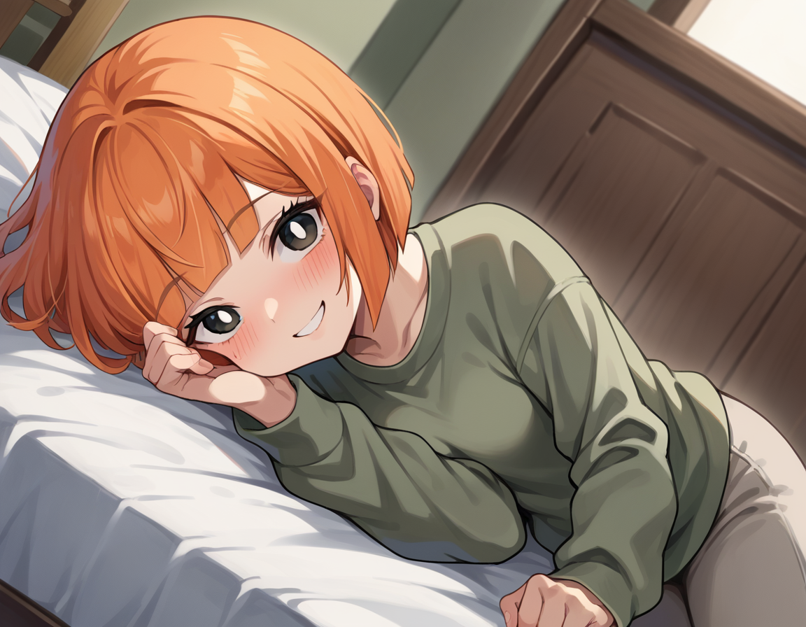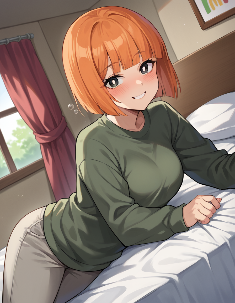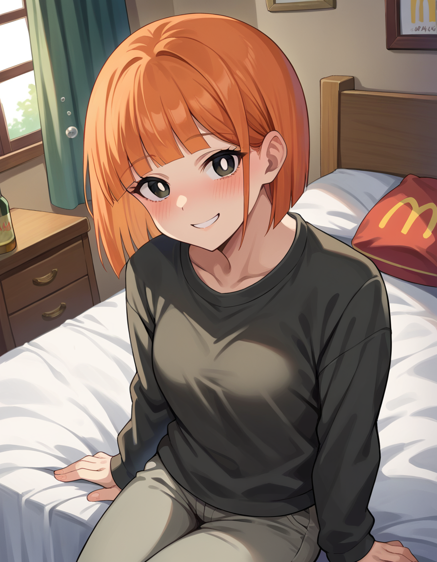 yoru mac, short hair, bangs, black eyes, blunt bangs, orange hair, bob cut, bright pupils,