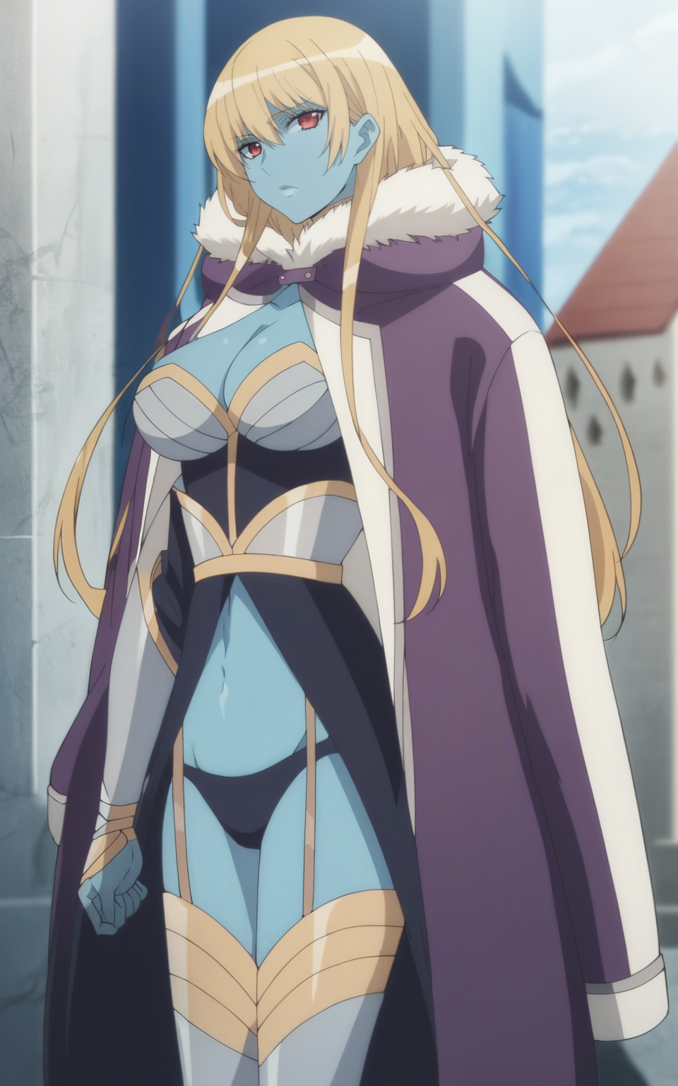 RONATSPNY 1GIRL, SOLO, LONG HAIR, BLONDE HAIR, RED EYES, BLUE SKIN, LARGE BREASTS ARMOR, CLEAVAGE, UNDERWEAR, BLACK PANTIES, NAVEL, CAPE, COAT, COAT ON SHOULDERS, CHOKER, GAUNTLETS, FUR TRIM, GARTER STRAPS, KNEE BOOTS, ARMORED BOOTS, GREAVES, GREY FOOTWEAR