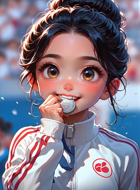 Best Keywords to use are "biting into Olympic medal, podium, "