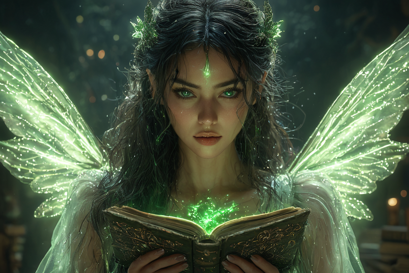 - Example prompts used:"A beautiful fairy with glowing wings reads an ancient book of magic and spells. She has detailed facial features and there is a glowing green light in the background with cinematic lighting, fairycore, hkmagic"