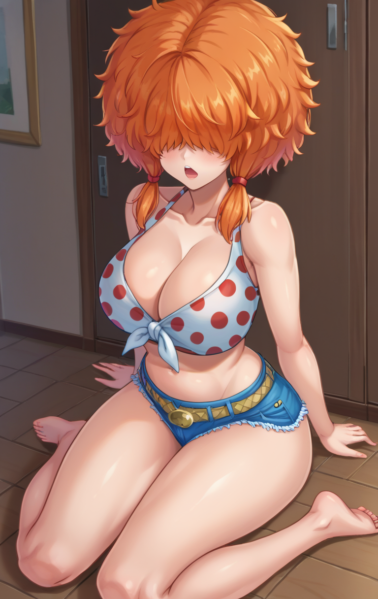 BellumSDXL,1girl,cleavage,bare shoulders,twintails,thighs,shorts,large breasts,curvy,thighs,midriff,belt,orange hair,lips,crop top,short shorts,makeup,low twintails,polka dot,denim,lipstick,afro,short twintails,front-tie top,blue shorts,denim shorts,hair over eyes,cutoffs,polka dot bikini