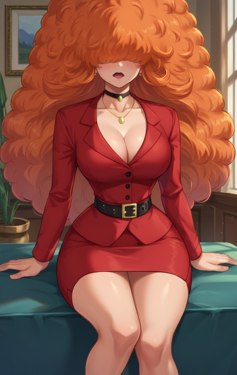 BellumSDXL,1girl,long hair,skirt,cleavage,jewelry,thighs,choker,belt,miniskirt,necklace,orange hair,lips,red skirt,formal,suit,pencil skirt,lipstick,red lips,hair over eyes,afro,big hair