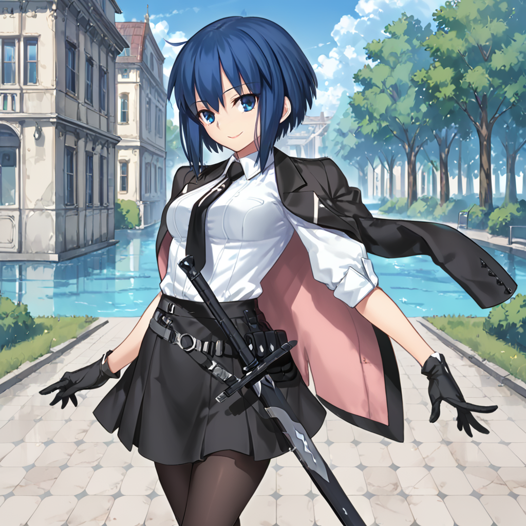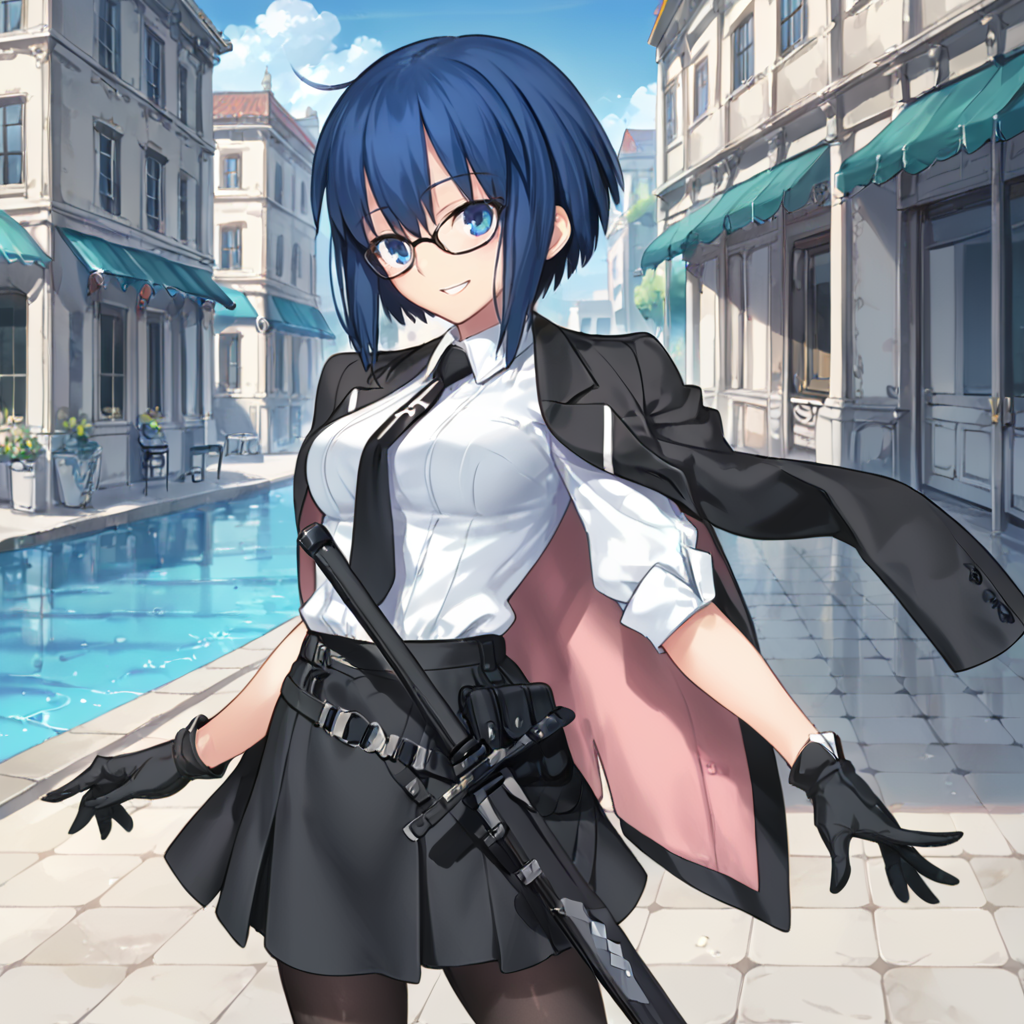 ciel_sensei, blue eyes, blue hair, short hair, black jacket, black skirt, white shirt, collared shirt, pantyhose, jacket on shoulders, black necktie, black gloves, black boots, high heels, knee boots, glasses, black-framed eyewear,