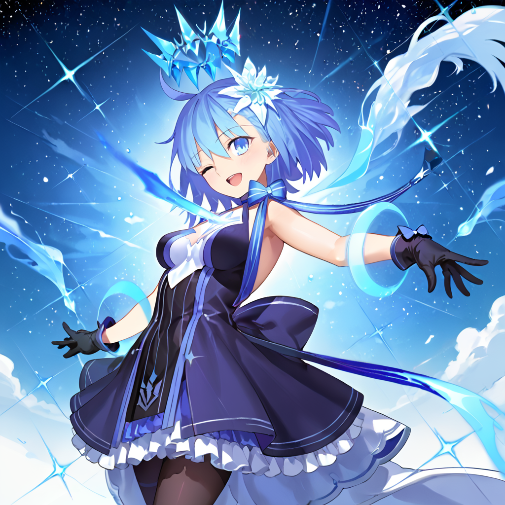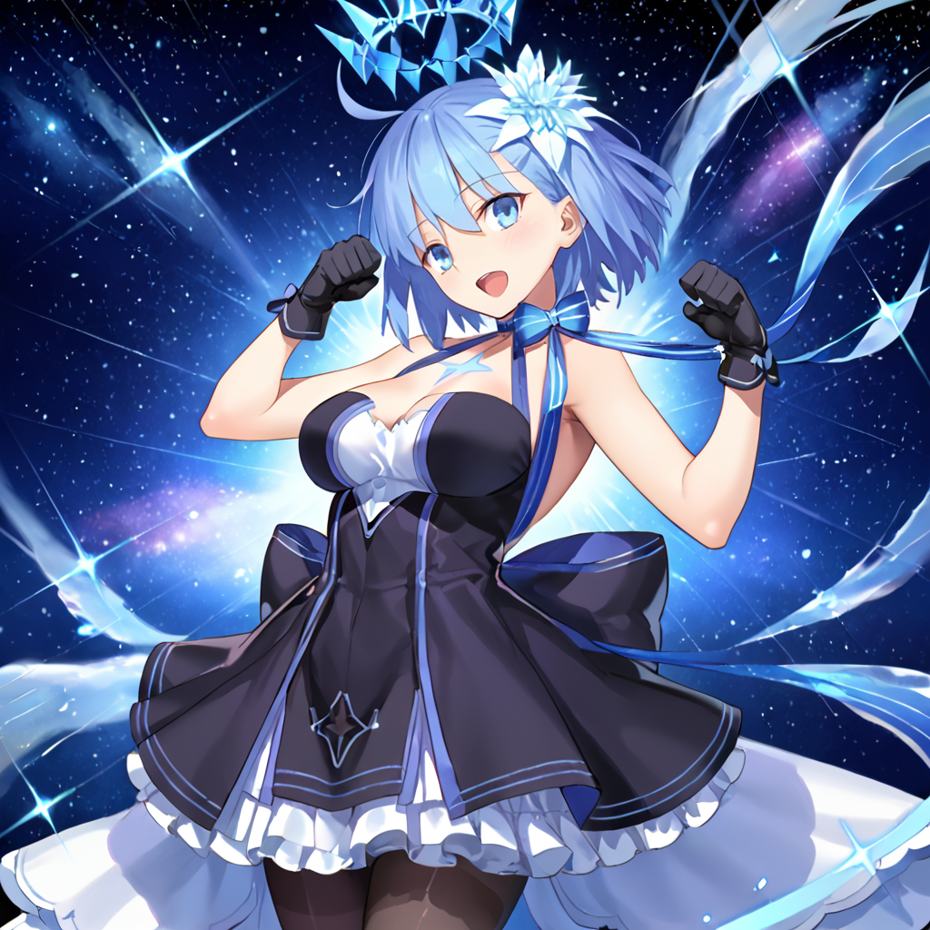 space_ciel, ahoge, blue eyes, short hair, light blue hair, hair ornament, chest mark, halo, blue dress, gloves, black gloves, pantyhose, bare shoulders, bow, ribbon choker, chest laser, flames,