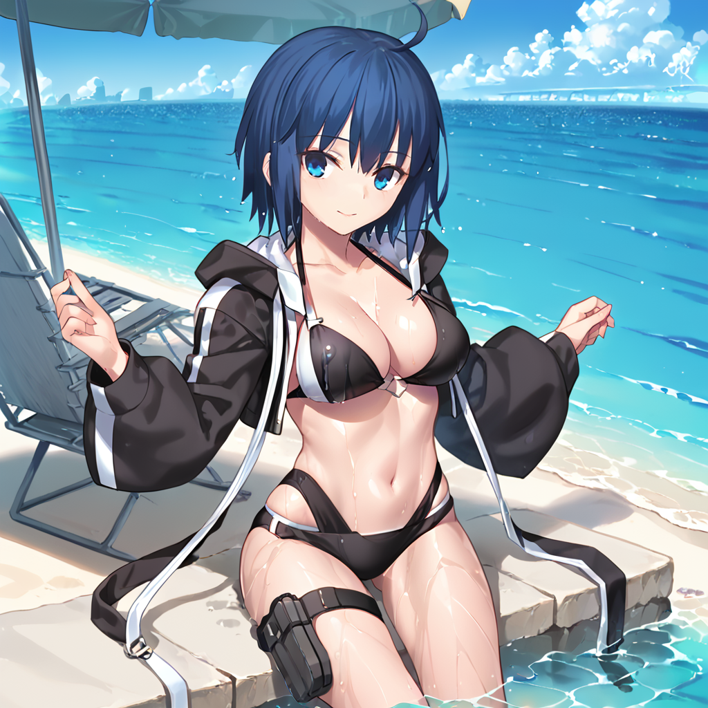 ciel, blue hair, blue eyes, short hair, ahoge, swimsuit, bikini, navel, black bikini, jacket, open clothes, long sleeves, open jacket,