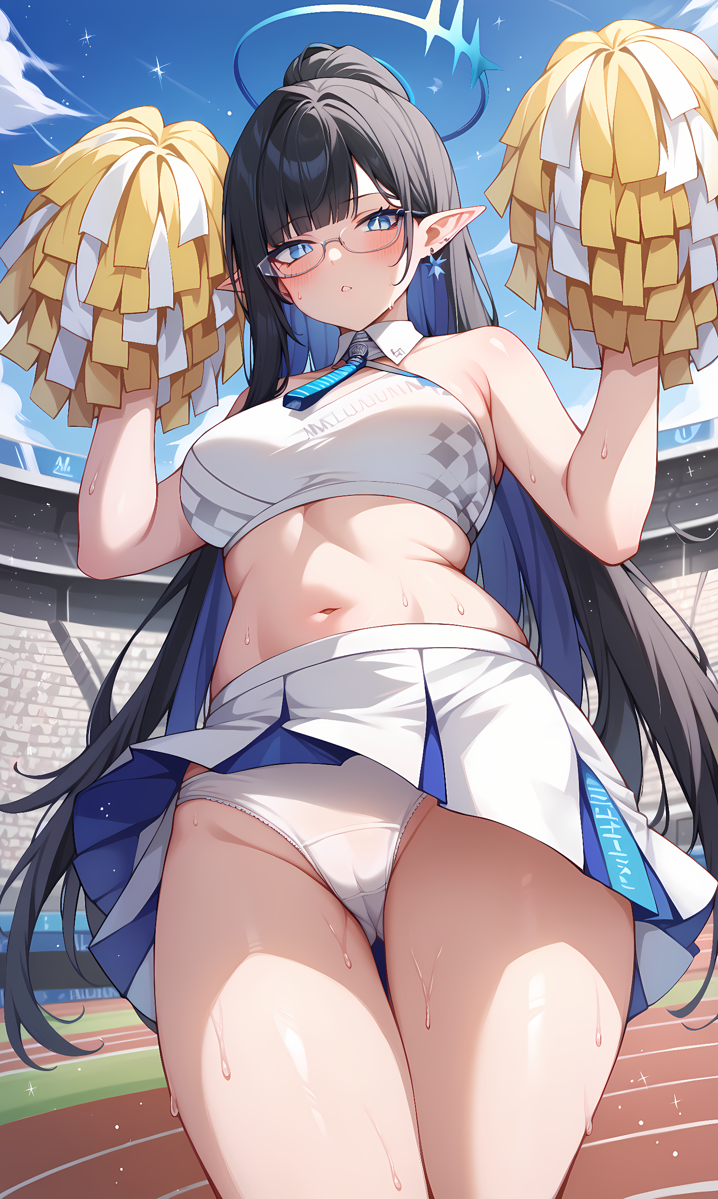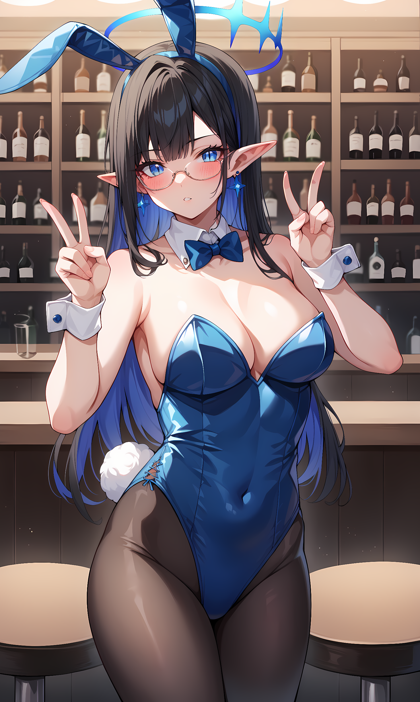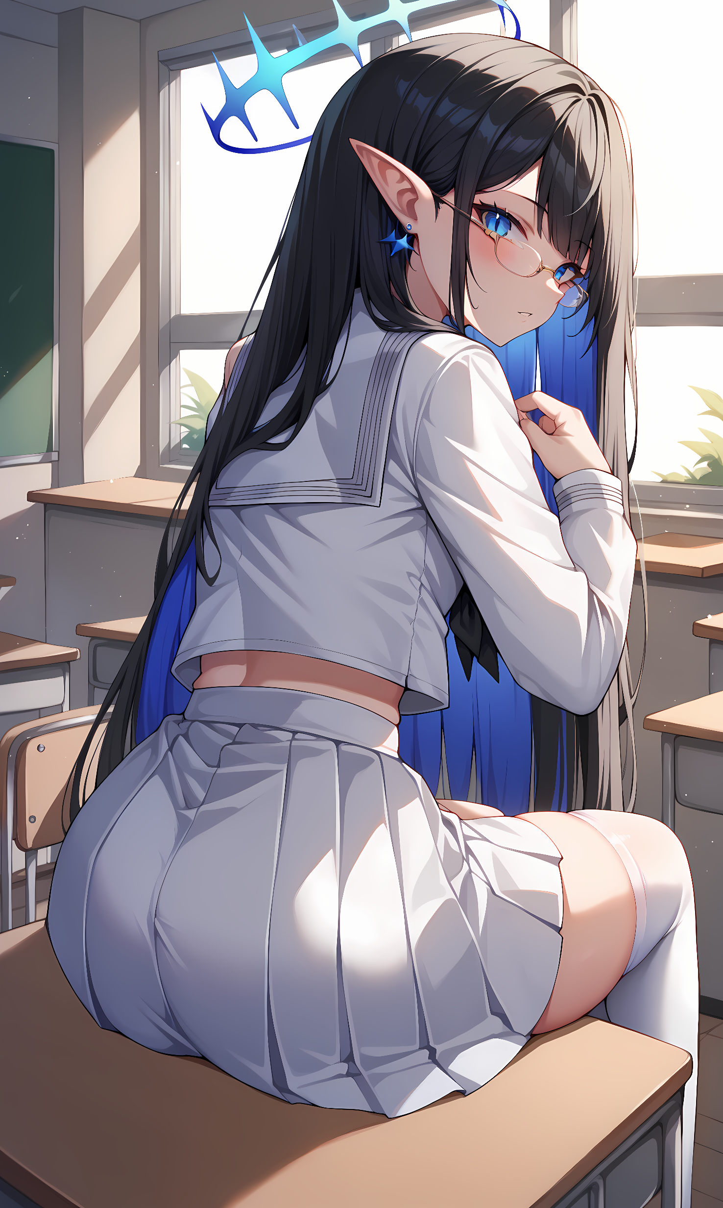 rin, blue eyes, slit pupils, black hair, colored-inner hair, absurdly long hair, pointy ears, halo, glasses, earrings