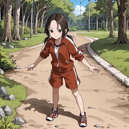 track jacket,red jacket,sleeves rolled up, track shorts,red shorts,