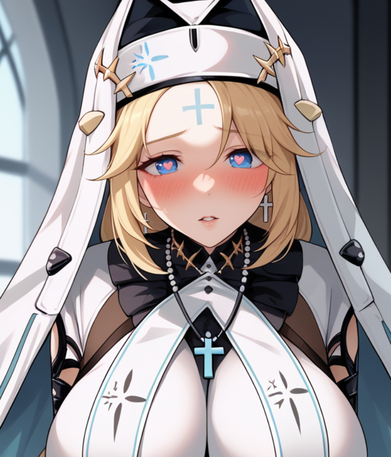 rpnzlpre, blue eyes, forehead mark, blonde hair, very long hair, braid, habit, nun, white veil, cross necklace, breast curtains, black dress, white shirt, elbow gloves, bodystocking, white thighhighs, garter straps, large breasts, wide hips