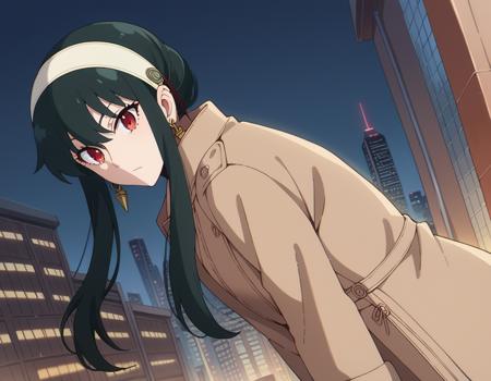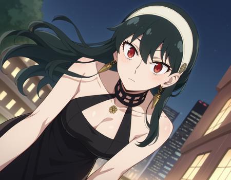 yor briar, black hair, red eyes, earrings, white hairband, hairband, long hair, sidelocks,