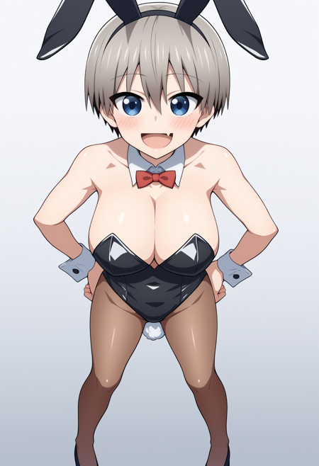 Basic prompts : 1girl, uzaki hana, grey hair, short hair, hair between eyes, bangs, blue eyes, skin fang, large breasts