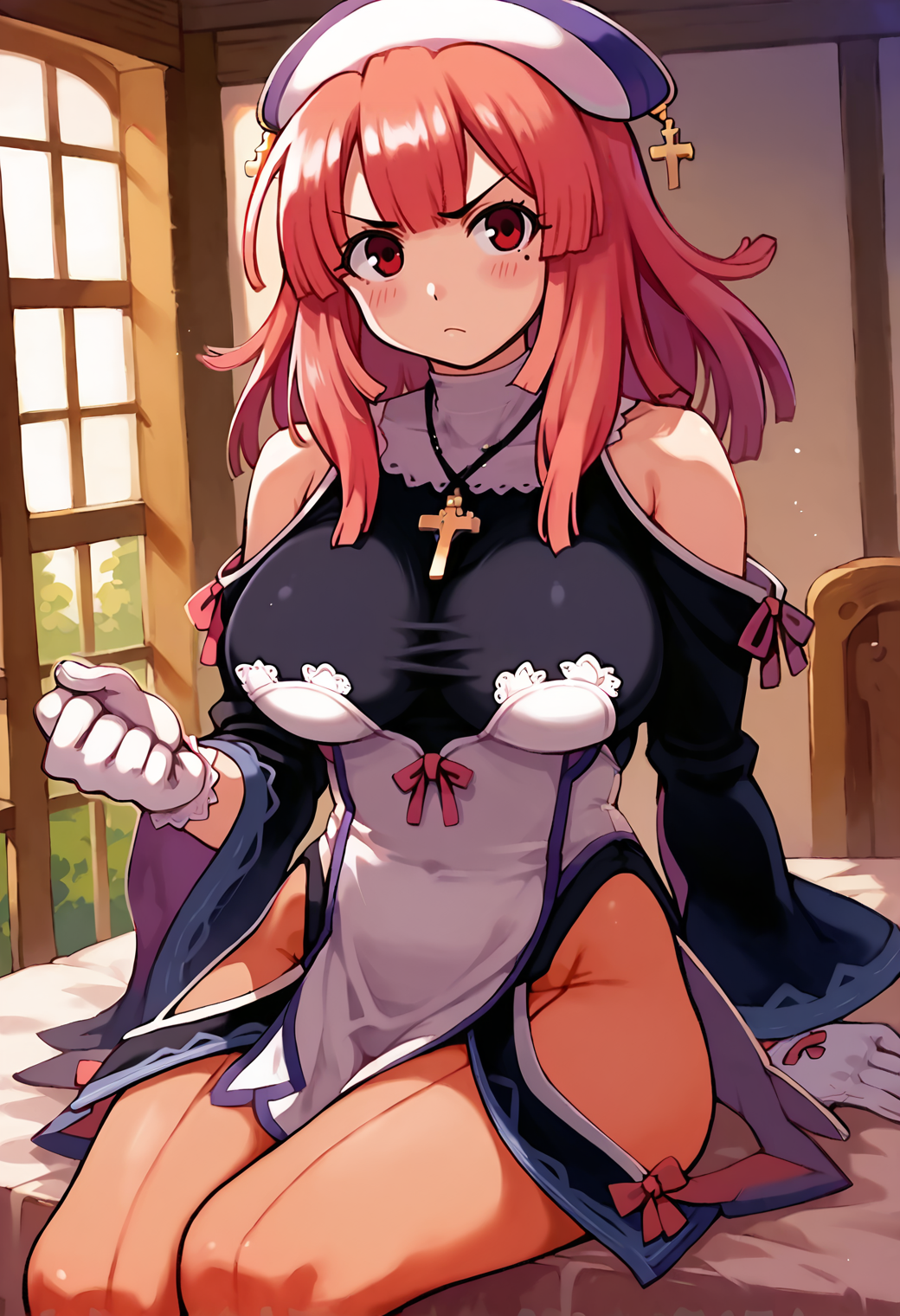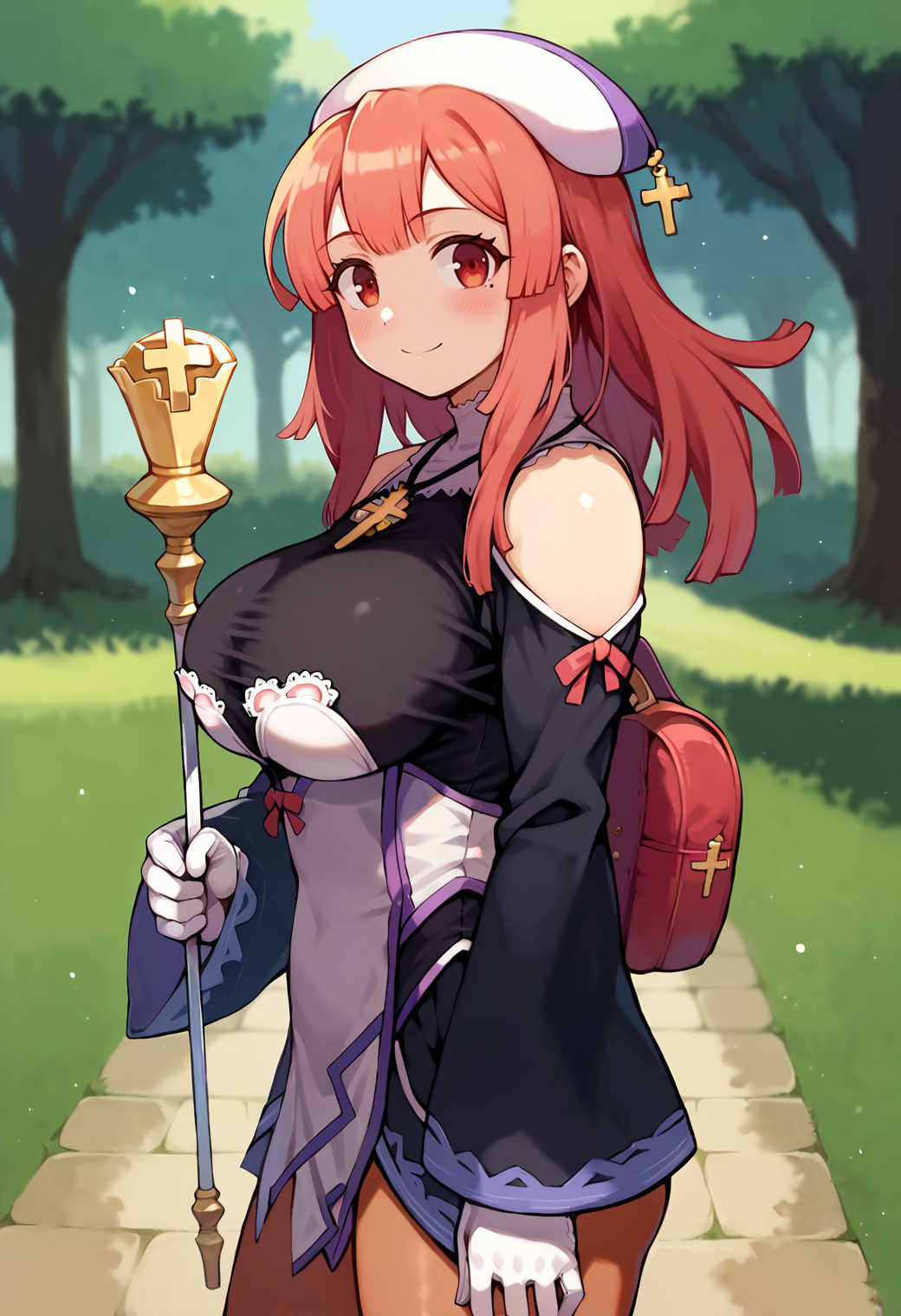 prierdef, hat, cross, necklace, black dress, hip vent, white tabard, bare shoulders, wide sleeves, gloves, pantyhose, boots, backpack,