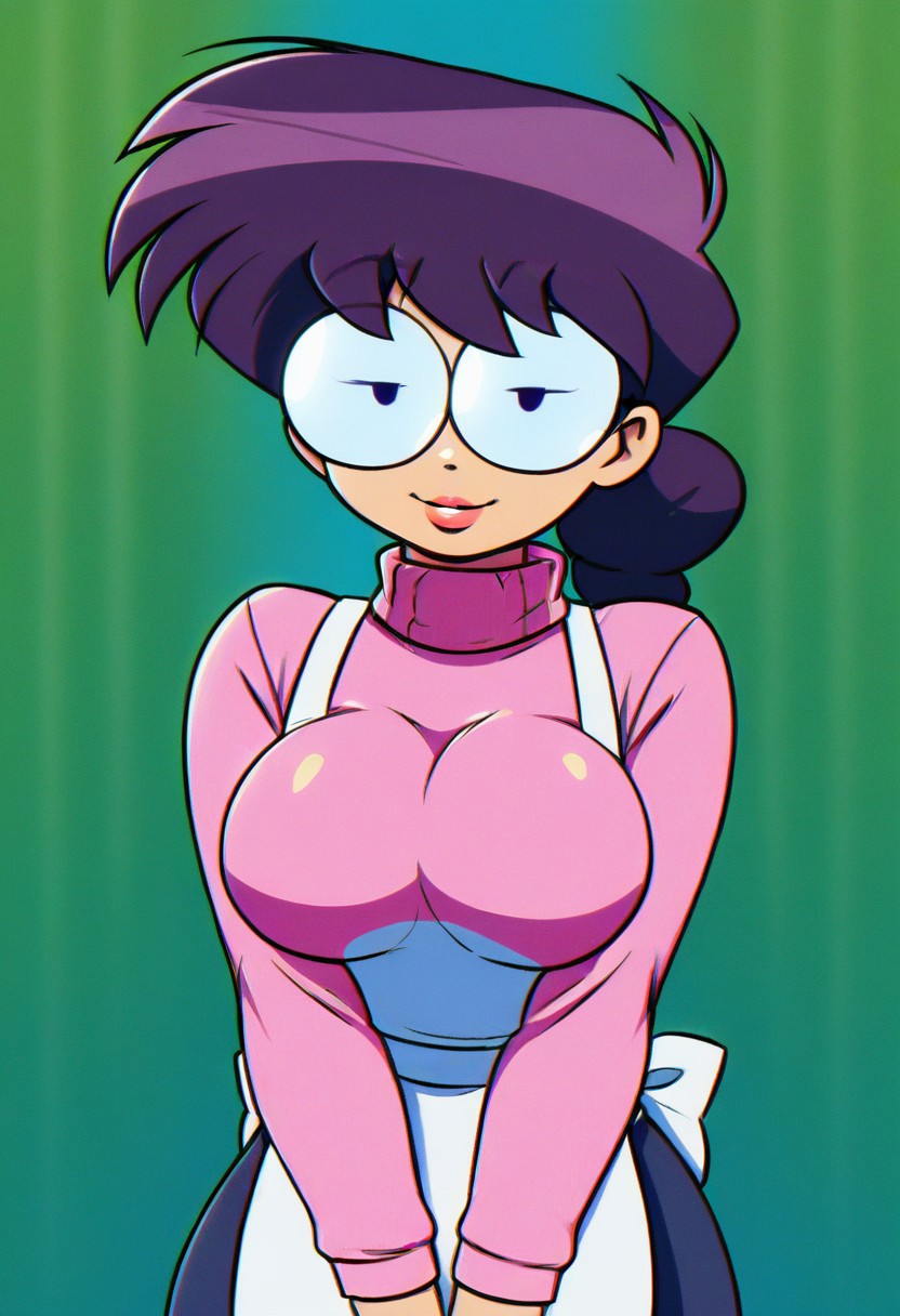 m4ma, purple hair, glasses, pink leotard, cleavage cutout, highleg, white gloves, knee pads, pink boots