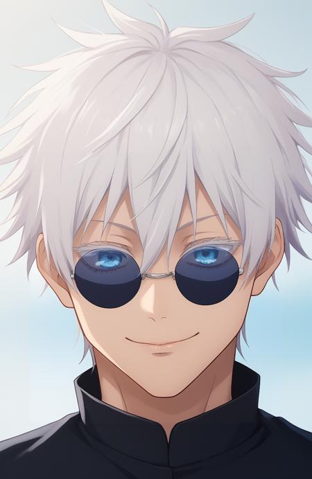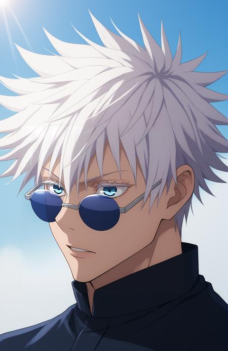 Prompt: 1boy, gojou satoru, white hair, short hair, spiked hair, blue eyes, colored eyelashes, sunglasses, hair between eyes,